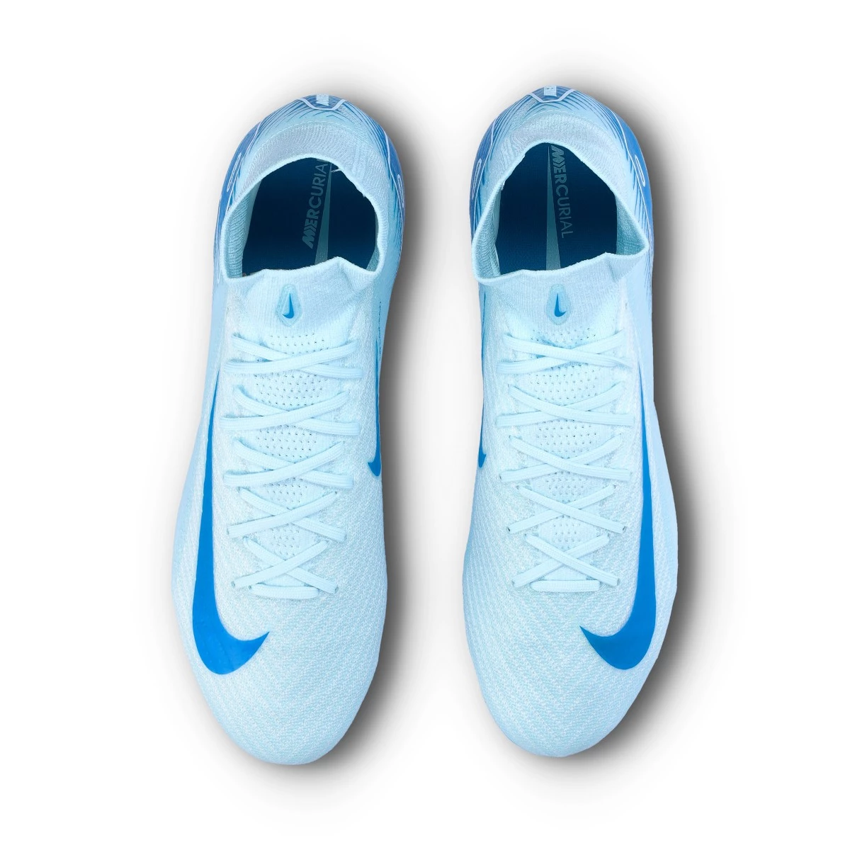 Chaussures de football Nike Air Zoom Mercurial Superfly 10 Elite FG. Chaussures en fil, avec maintien de la cheville, pour une utilisation sur les terrains en gazon naturel. Chaussures haut de gamme pour les joueurs rapides en Glacier Blue-Blue Orbit.