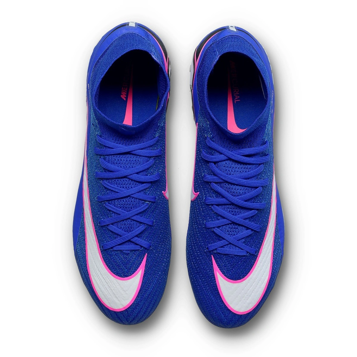 Chaussures de football Nike Air Zoom Mercurial Superfly 10 Elite SG-Pro pour adultes. Chaussures en knit, avec chaussette, pour terrains en gazon naturel particulièrement humides. Chaussures haut de gamme pour joueurs rapides en couleur Racer Blue-White.