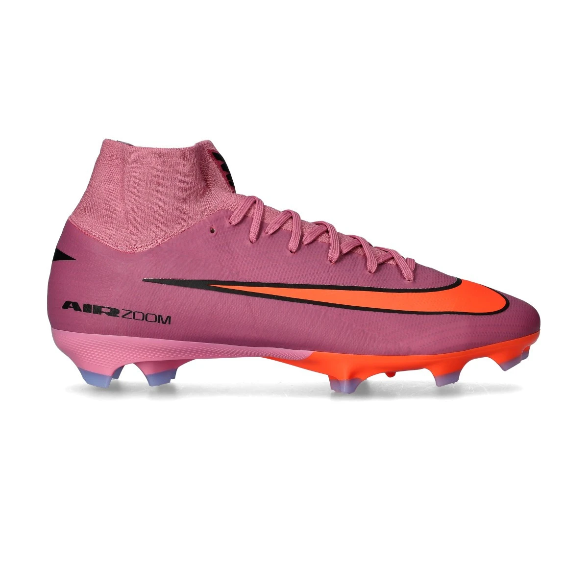 Chaussures de football Nike Air Zoom Mercurial Superfly 10 Pro FG pour adulte. Modèle en maille avec col montant (chaussette intégrée), conçu pour les terrains en gazon naturel. Chaussures haut de gamme pensées pour les joueurs rapides, dans un coloris audacieux Magic Flamingo / Black / Total Crimson.