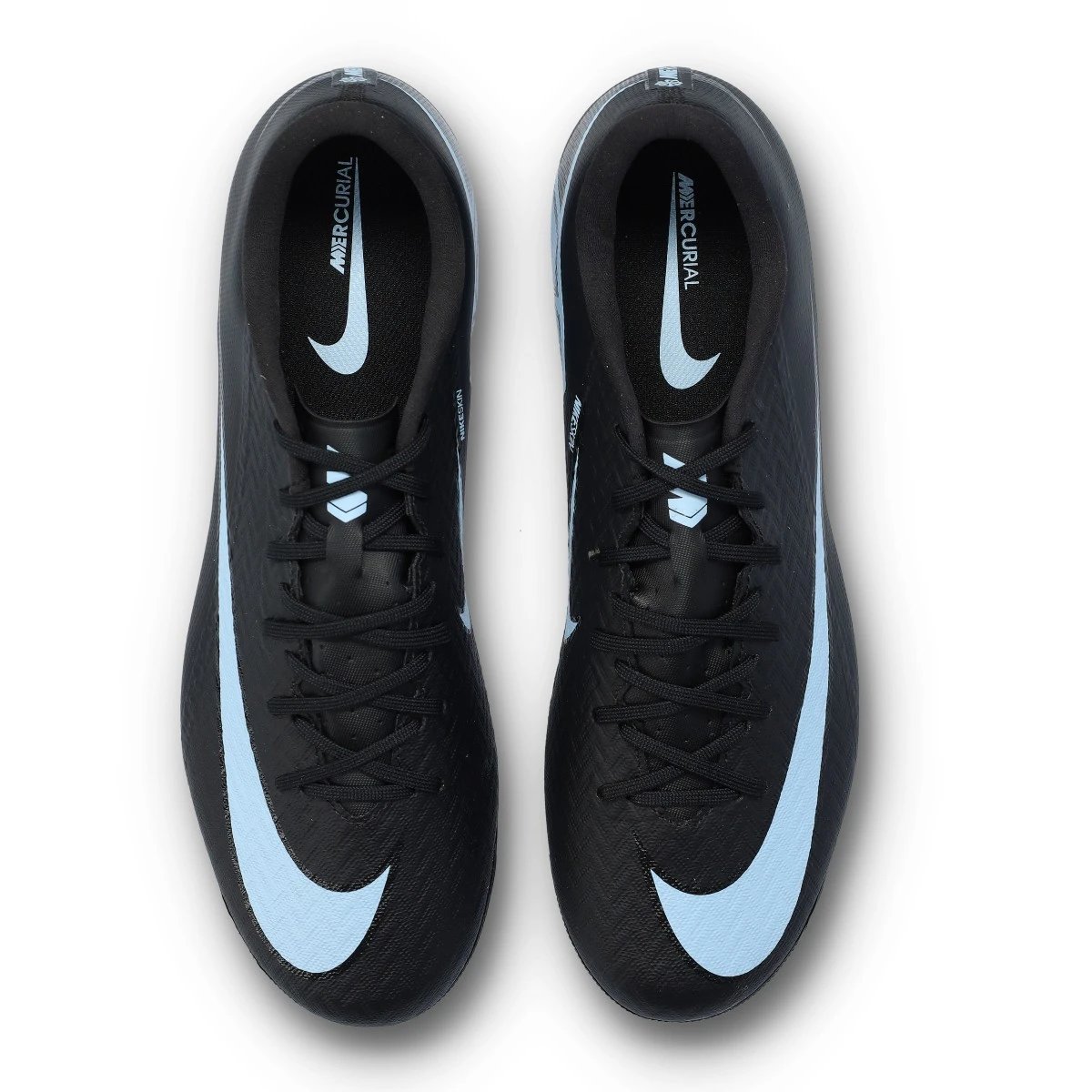 Chaussures en maille, conçues pour les terrains en gazon naturel ou artificiel. Modèle de gamme intermédiaire en coloris Black-Ice Blue.
