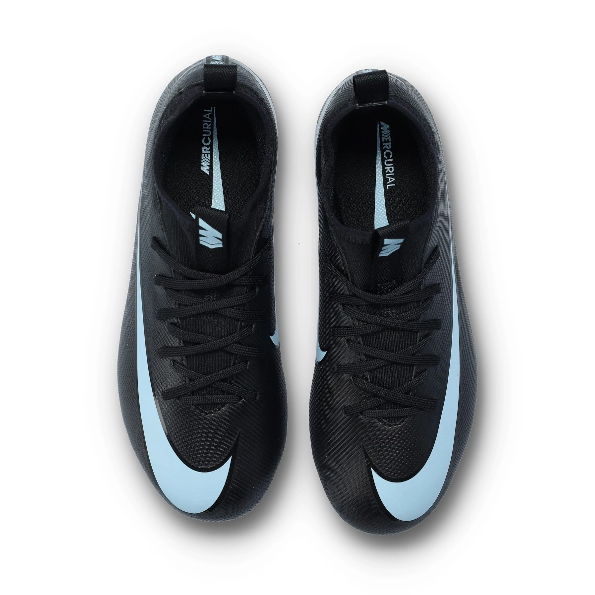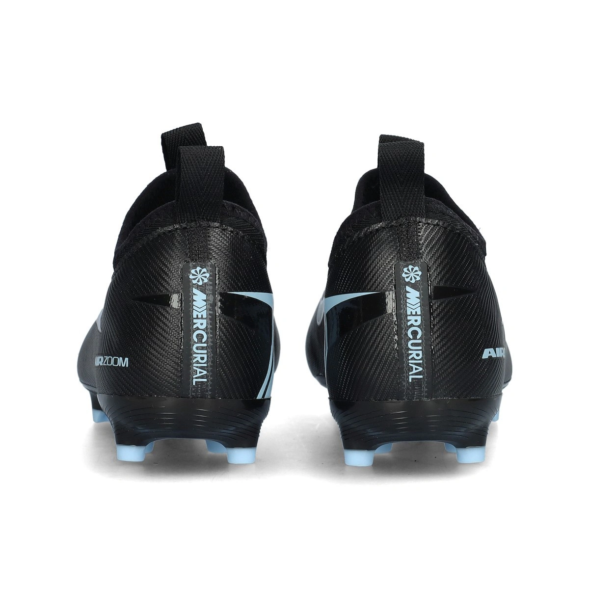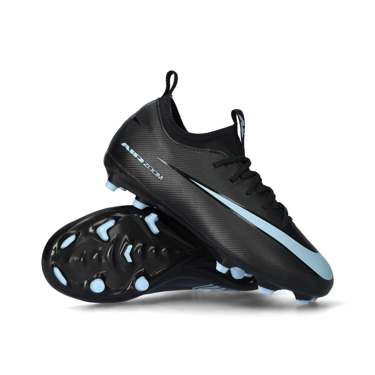 Chaussures de football Nike Air Zoom Mercurial Vapor 16 Academy FG/MG pour enfant. Chaussures en maille, conçues pour terrains naturels ou gazon artificiel de toutes générations. Modèle de gamme moyenne en coloris Black-Ice Blue.