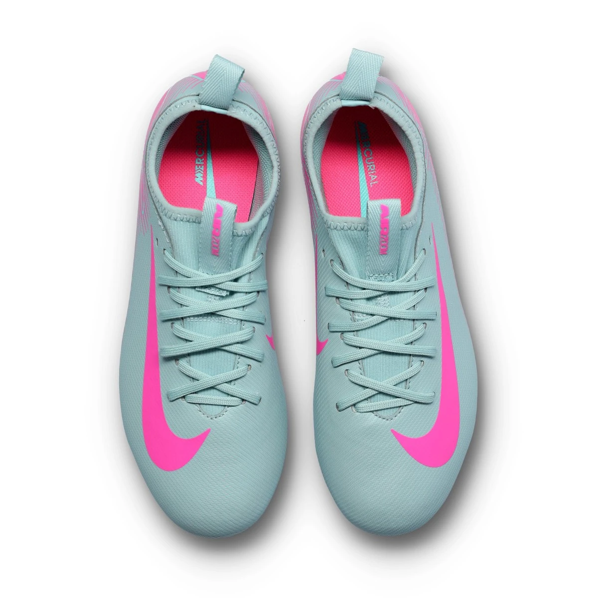 Chaussures de football Nike Zoom Mercurial Vapor 16 Academy FG/MG pour enfant. Chaussures filetées, pour utiliser les terrains naturels ou en gazon artificiel de toute génération. Chaussures de milieu de gamme en Ocean Cube-Pink Blast.