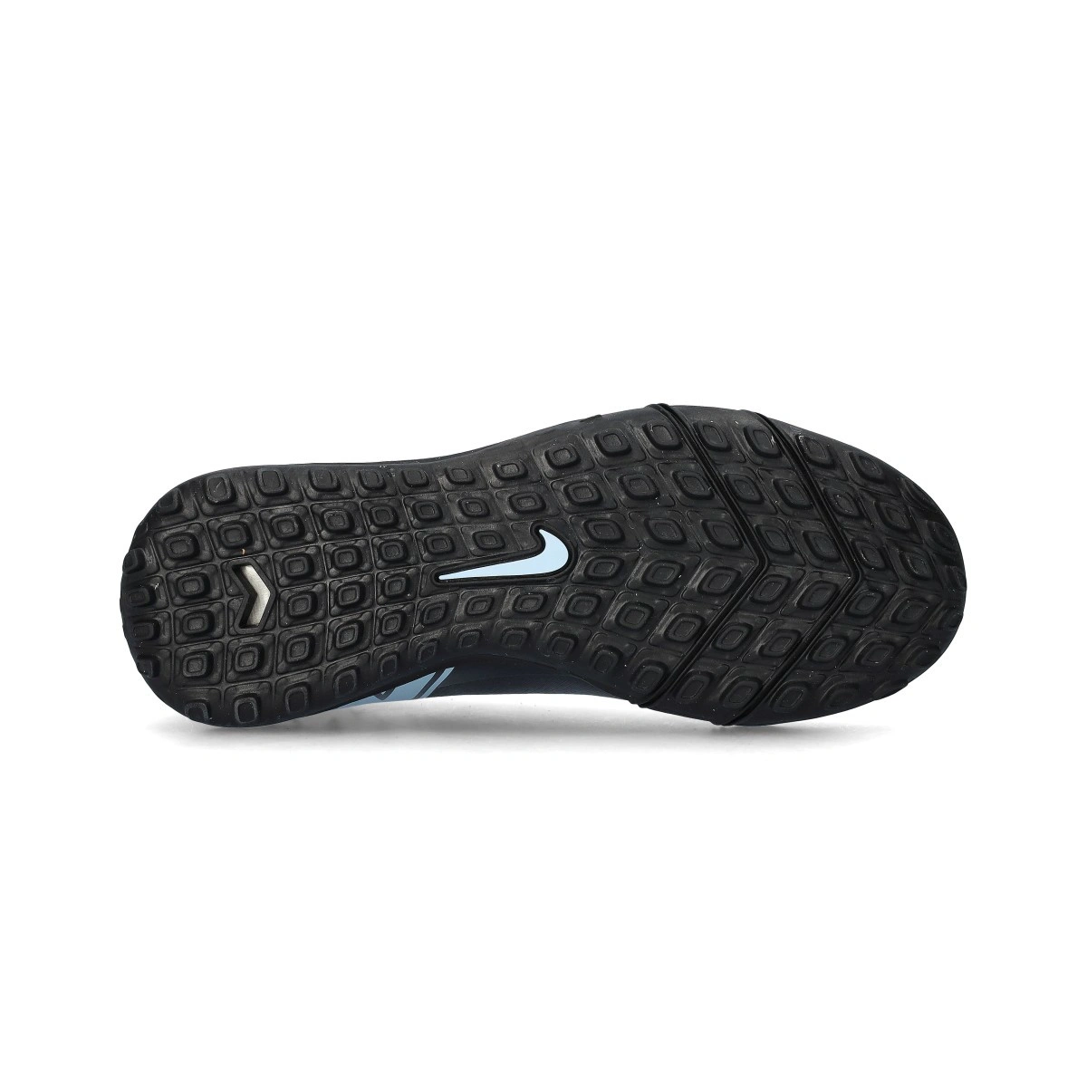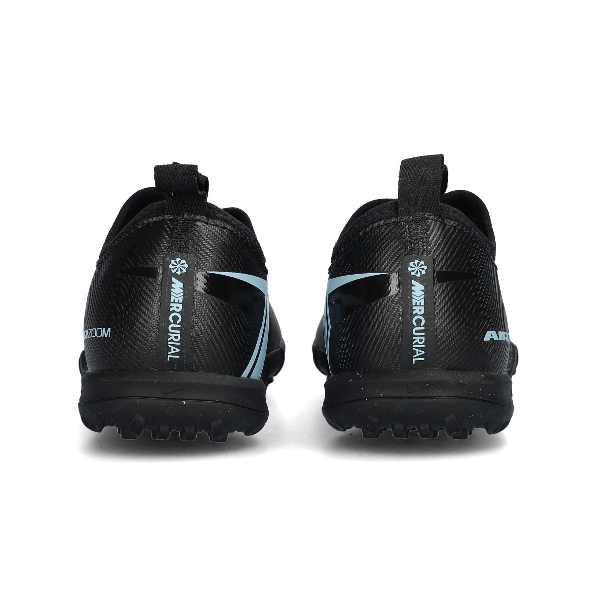 Chaussures de football Nike Air Zoom Mercurial Vapor 16 Academy Turf pour enfant. Chaussures en maille, conçues pour terrains en moquette ou gazon artificiel. Modèle de gamme moyenne en coloris Black-Ice Blue.
