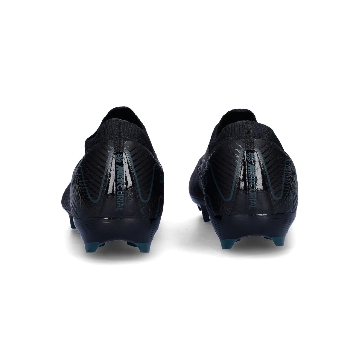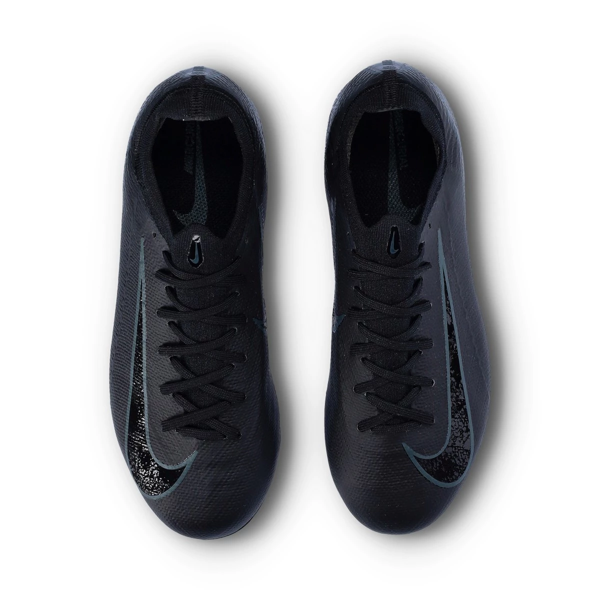 Chaussures de football Nike Zoom Mercurial Vapor 16 Pro FG pour enfant. Chaussures à lacets pour une utilisation sur des terrains en gazon naturel secs ou humides. Chaussures de milieu de gamme en Black-Black-Deep Jungle.