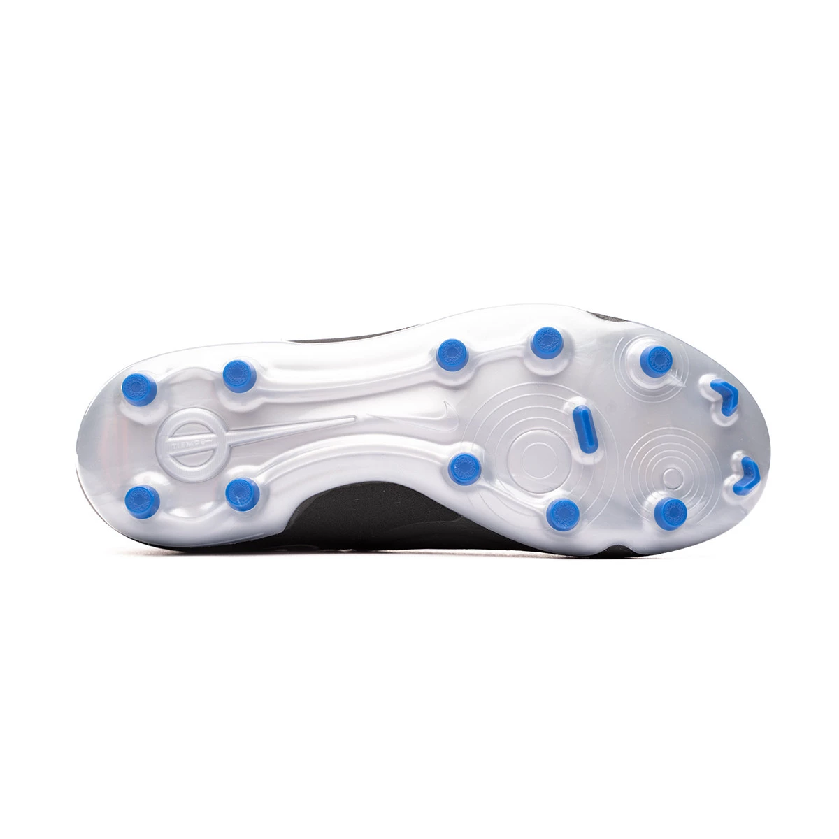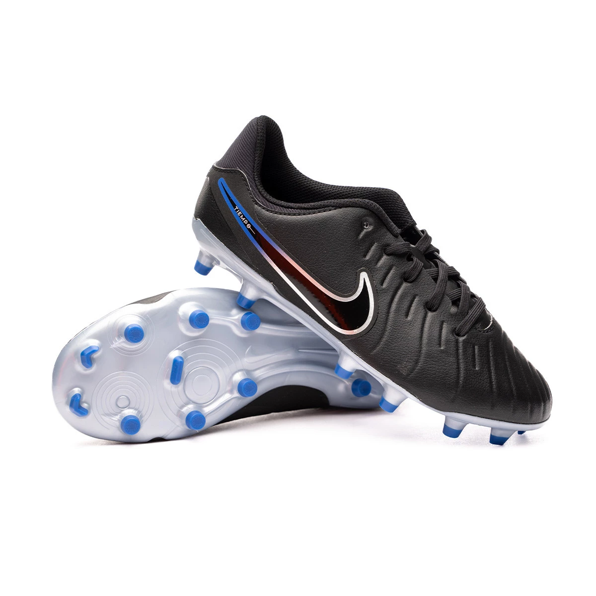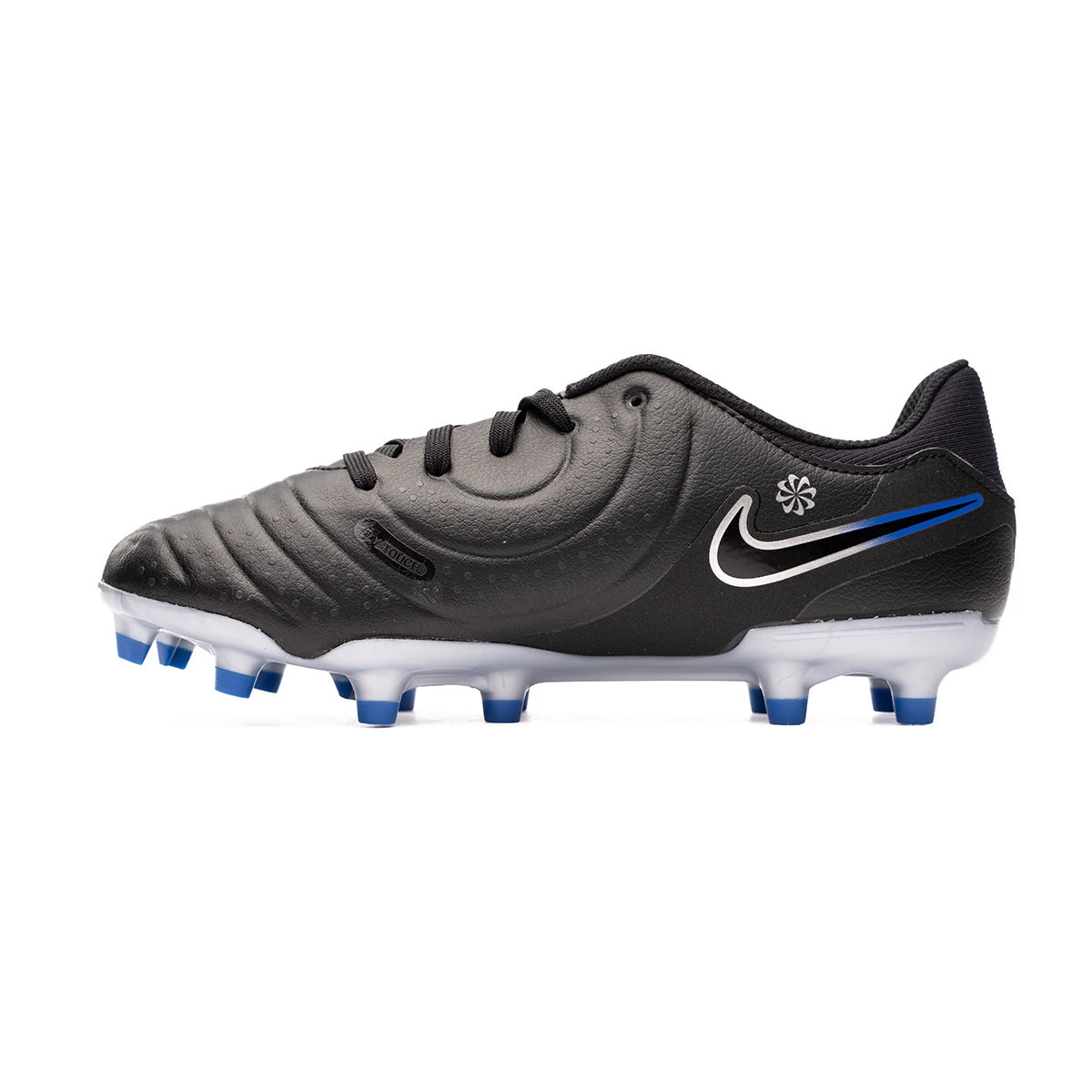 Chaussures de football Nike Legend 10 Academy FG/MG pour enfant. Chaussures en cuir FlyTouch Plus, à utiliser sur les terrains en gazon naturel ou artificiel. Bottes de la gamme Initiation de couleur Noir-Chrome-Hyper Royal.