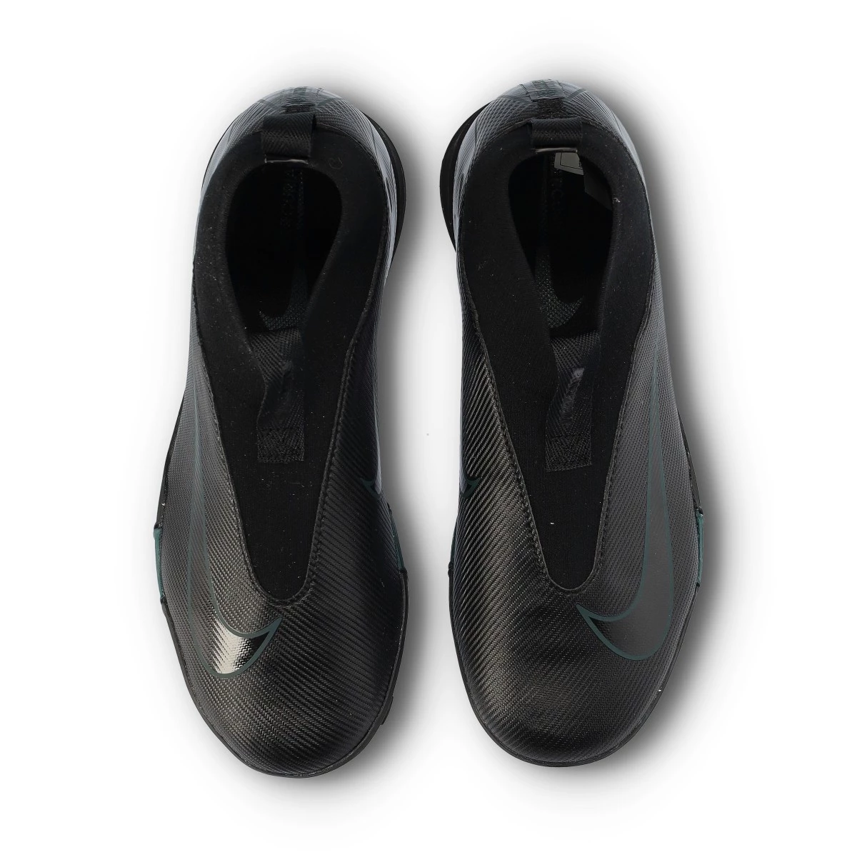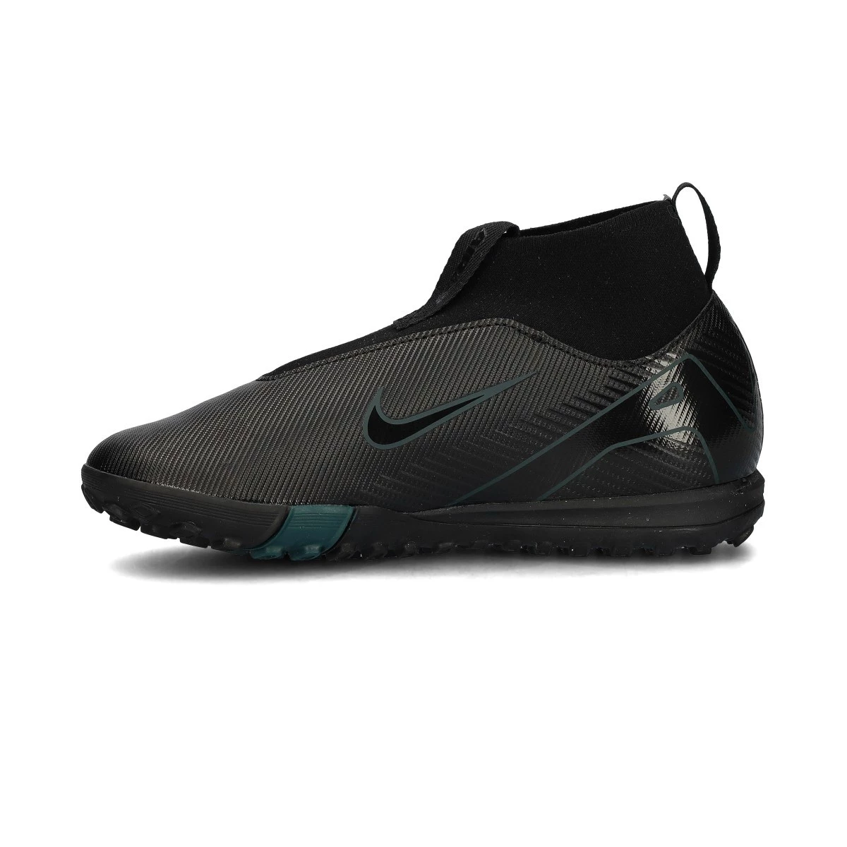 Crampons Nike Zoom Mercurial Superfly 10 Academy Turf pour enfants. Tige synthétique avec doublure en chaussette pour une utilisation sur moquette, gazon artificiel ou terrains en béton. Chaussures pour amateurs en noir-noir-jungle profond.