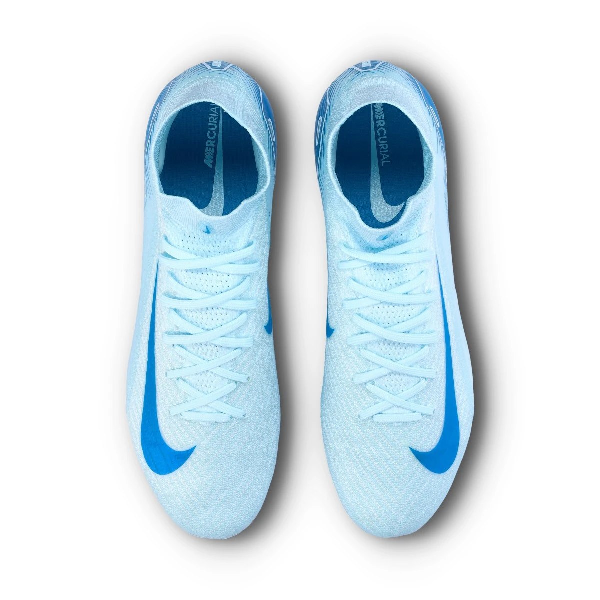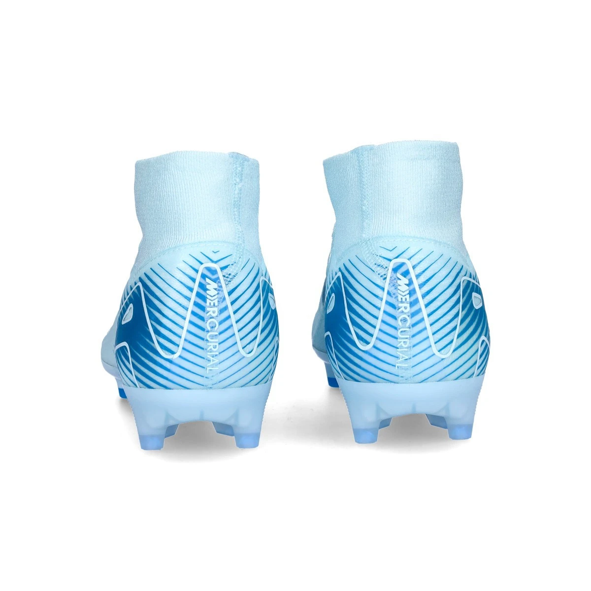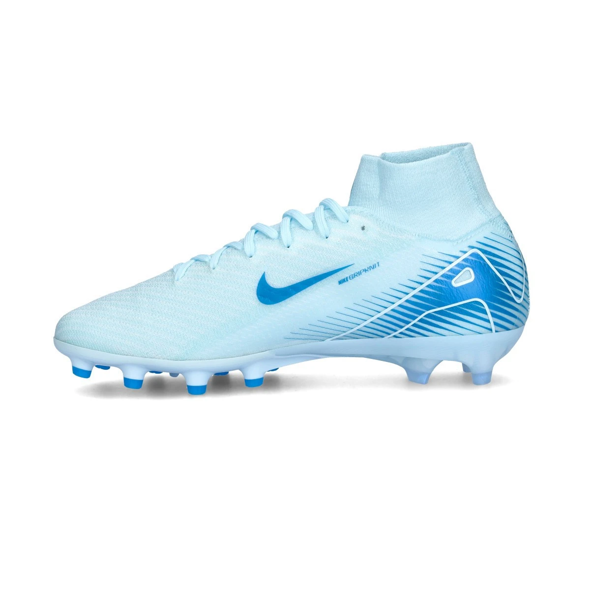 Chaussures de football Nike Air Zoom Mercurial Superfly 10 Elite AG-Pro. Chaussures montantes en fil pour une utilisation sur les terrains en gazon artificiel. Chaussures haut de gamme pour les joueurs rapides en coloris Glacier Blue-Blue Orbit.