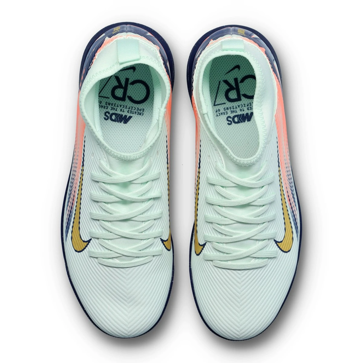 Chaussures de football Nike Mercurial Superfly 10 Club Turf. Chaussures en synthétique avec chaussette, conçues pour être utilisées sur des terrains en moquette, gazon artificiel ou ciment. Chaussures de niveau de base en coloris Barely Green-Mtlc Gold Coin-Crimson Pulse-Blu.