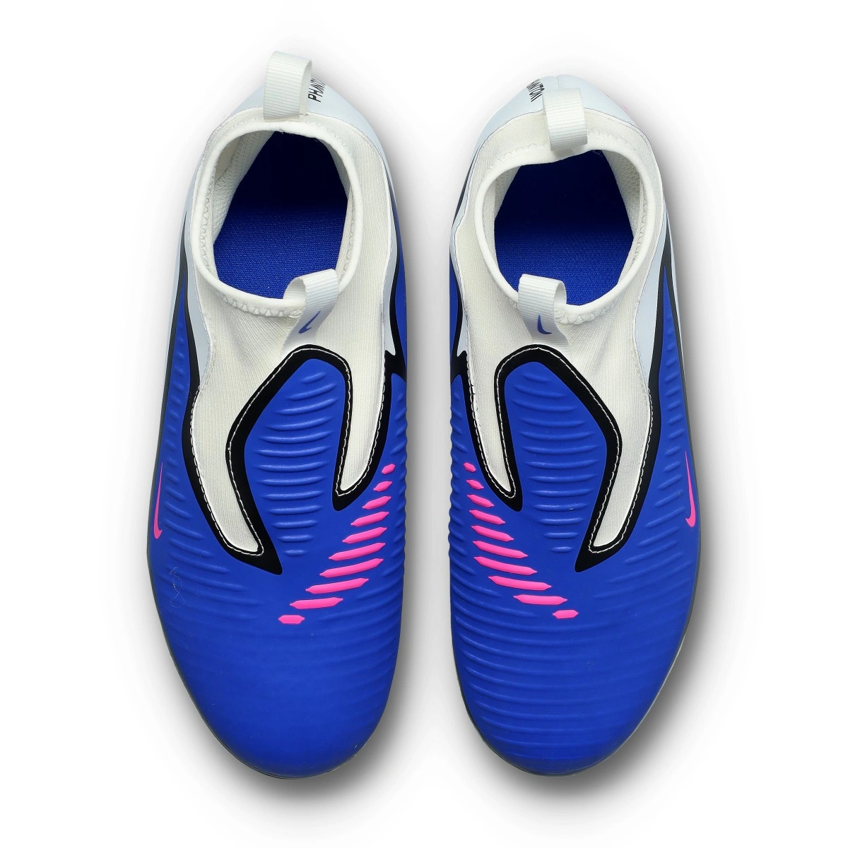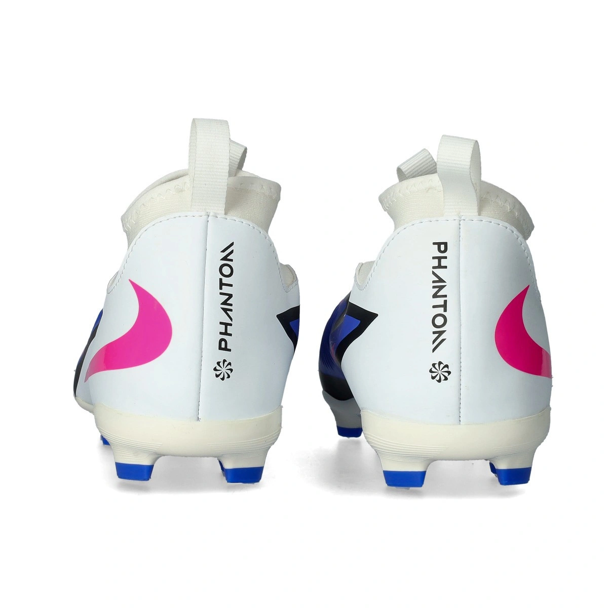 Chaussure de football Nike Phantom 6 High Academy FG/MG pour enfant. Chaussure en maille avec chaussette, pour terrains en herbe naturelle sèche ou artificielle de première génération. Chaussures haut de gamme pour joueurs de contrôle et de précision en couleur Racer Blue-Pink Blast-White.
