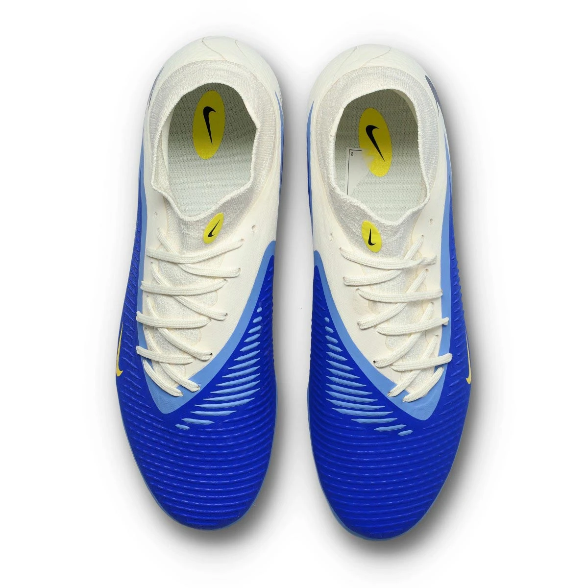 Chaussures de football Nike Phantom 6 High Academy FG/MG. Chaussure à chaussettes, à utiliser sur gazon naturel sec ou sur les terrains en gazon artificiel de première génération. Chaussures haut de gamme pour les joueurs de contrôle et de précision en Racer Blue-Dk Obsidian.