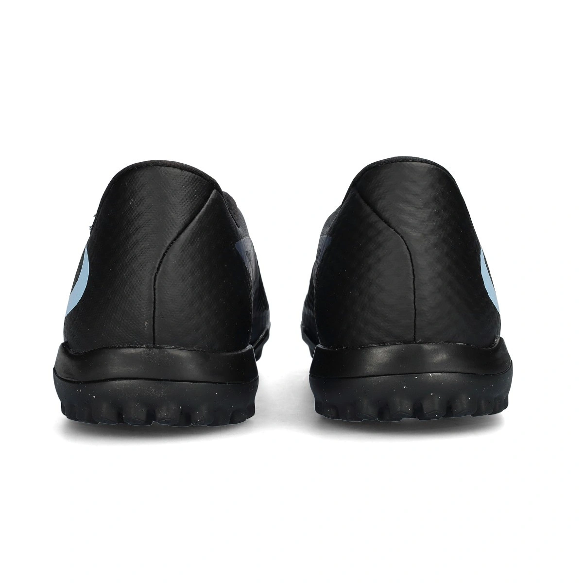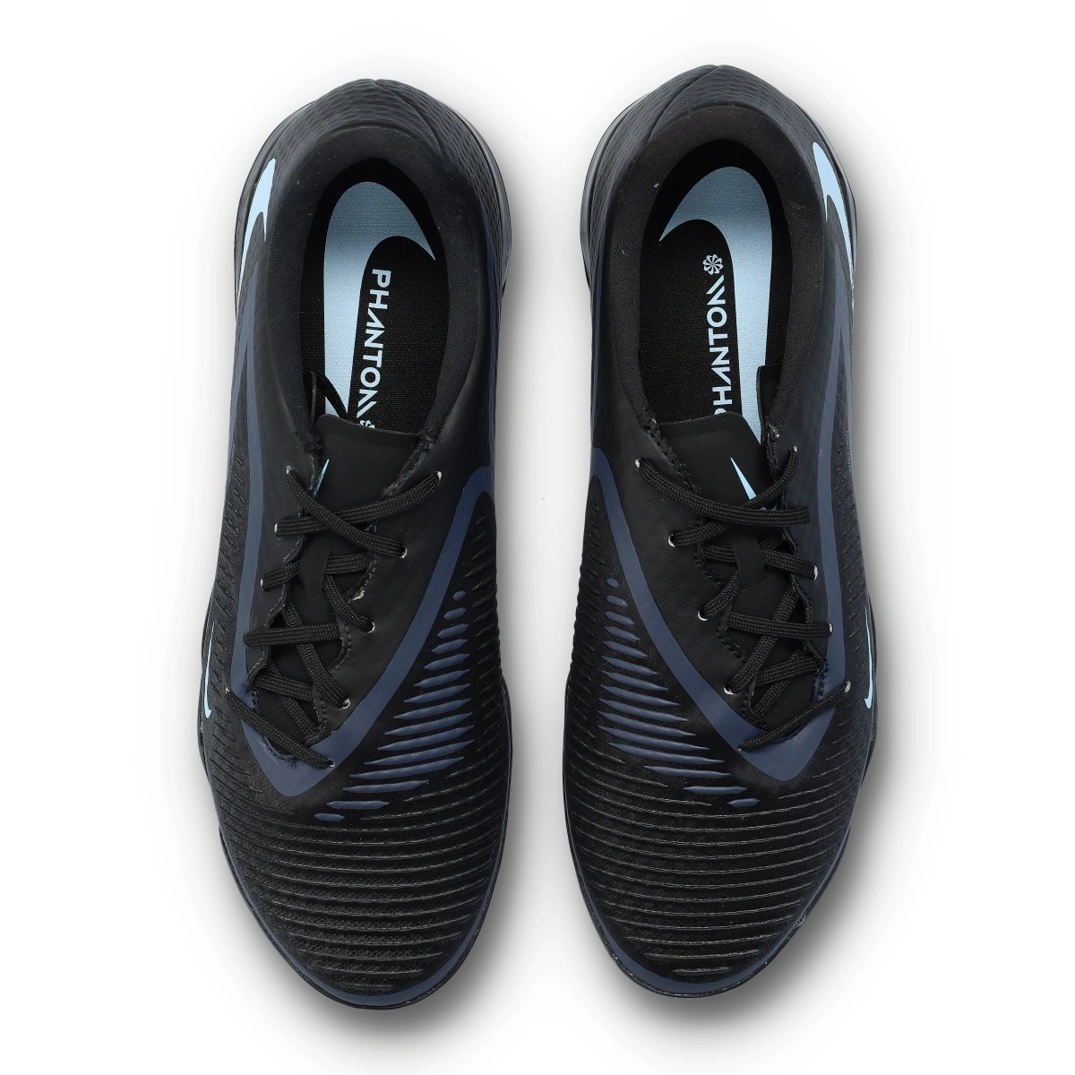 Chaussures de football Nike Phantom 6 Low Academy Turf. Chaussures en maille sans chausson, conçues pour les terrains en moquette ou gazon artificiel. Modèle de gamme intermédiaire destiné aux joueurs axés sur le contrôle et la précision, en coloris Black-Black.