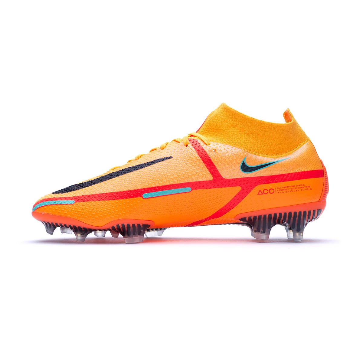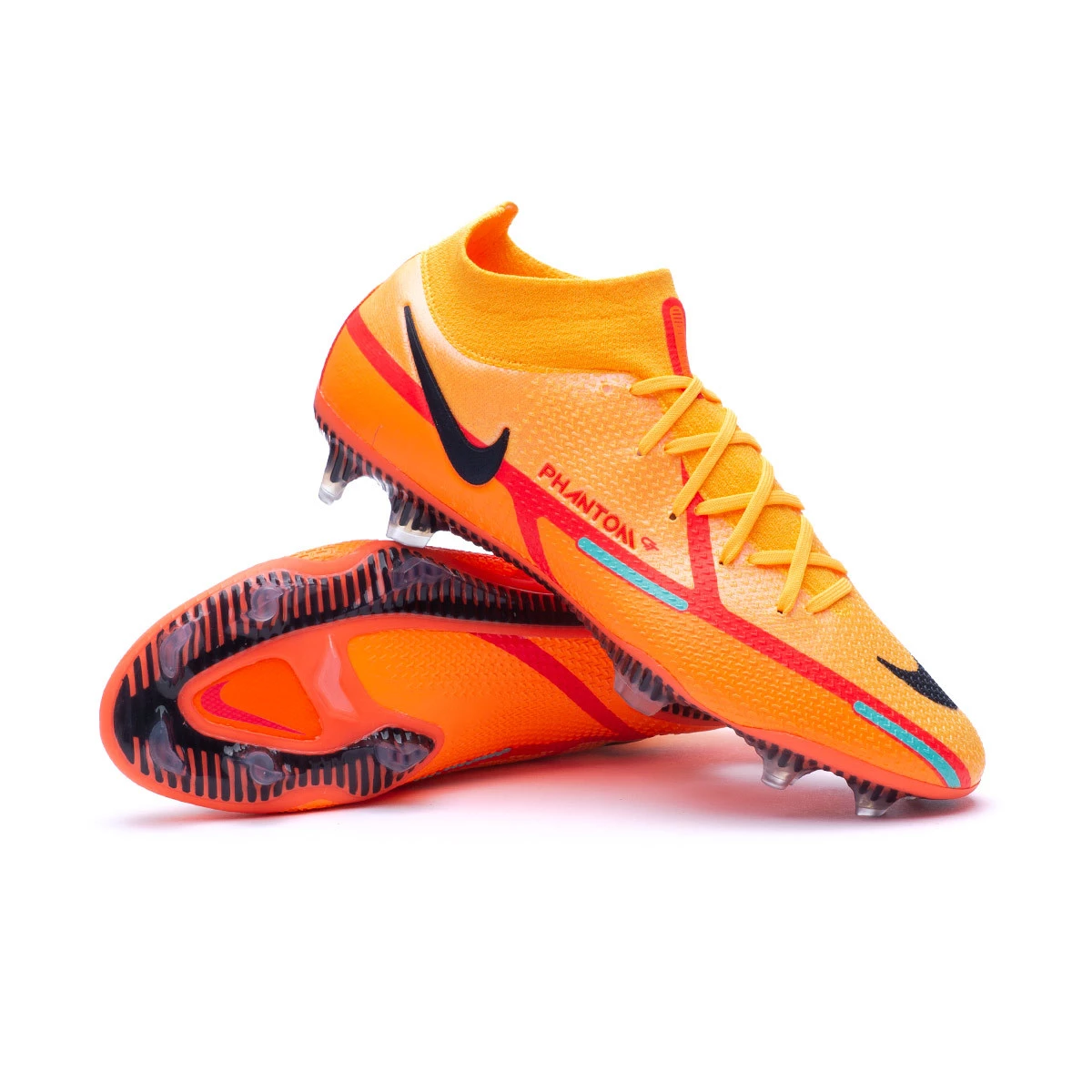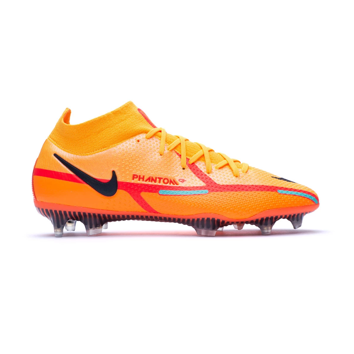 Chaussures de football Nike Phantom GT2 Elite DF FG pour adulte. Chaussures avec chaussette intégrée à porter en terrain naturel sec ou humide. Chaussures haut de gamme pour les joueurs de contrôle et précision. Couleur Laser Orange-Black-Total Orange-Brt Crimson.