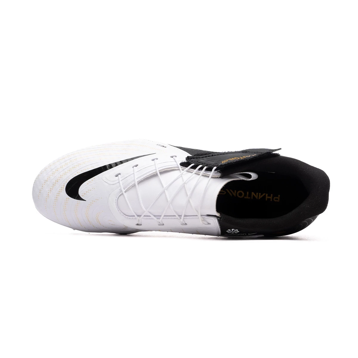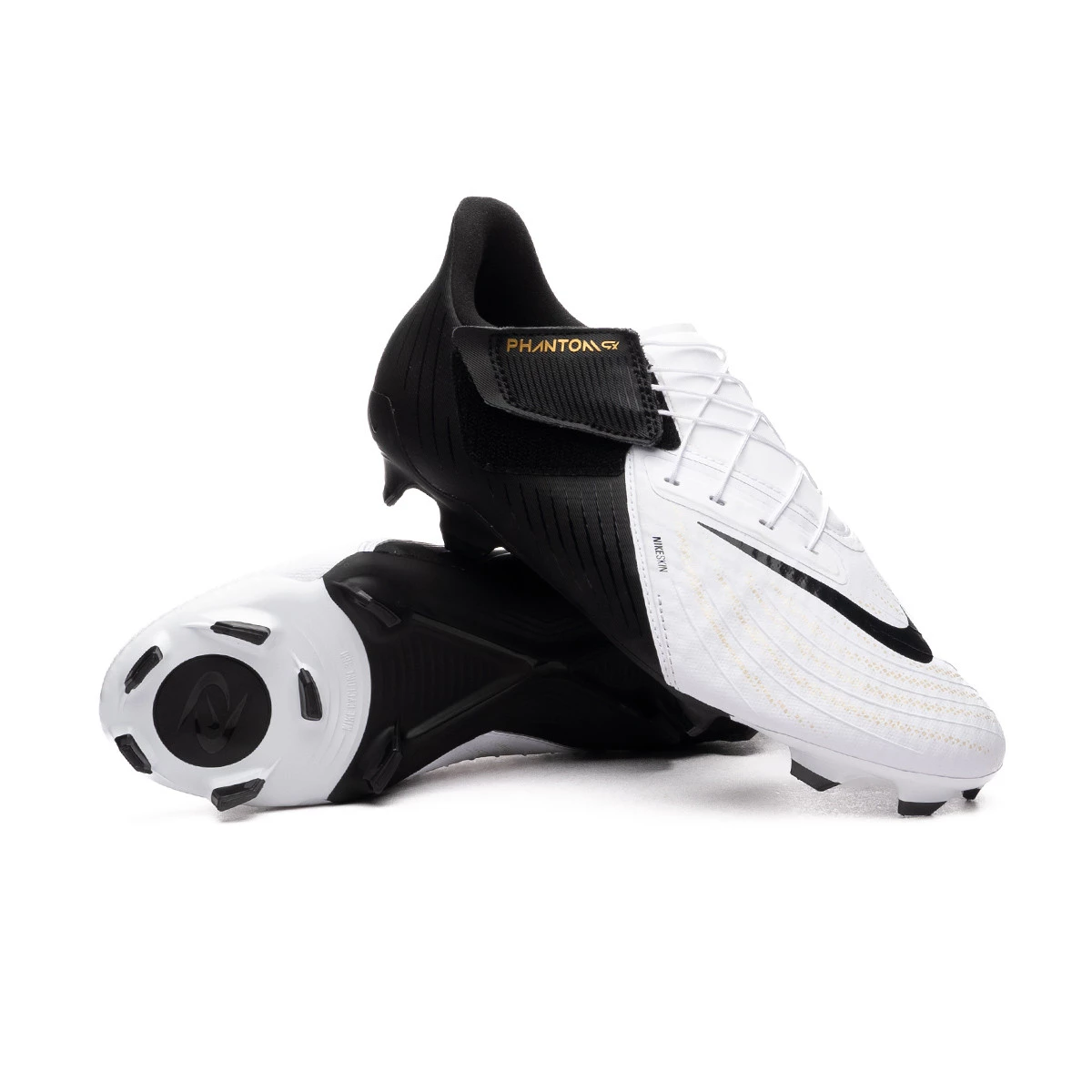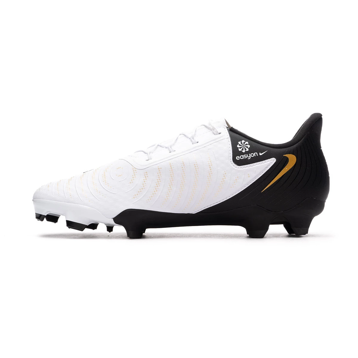 Chaussure de football Nike Phantom GX ll Academy Easy On FG/MG. Chaussure en fil avec chaussette, à utiliser sur les terrains en gazon naturel sec ou humide. Chaussure de base pour joueurs de contrôle et de précision en couleur White-Black-Mtlc Gold Coin,