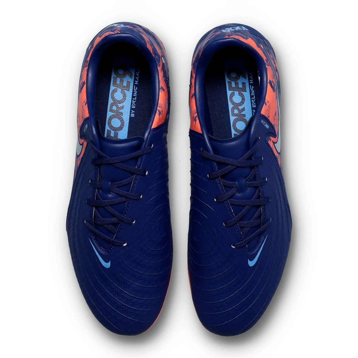 Chaussures de football Nike Phantom GX ll Academy FG/MG EH. Chaussure filetée avec chaussette, pour une utilisation sur des terrains en gazon naturel secs ou humides. Chaussure haut de gamme pour les joueurs de contrôle et de précision en Bleu Void-Chrome.