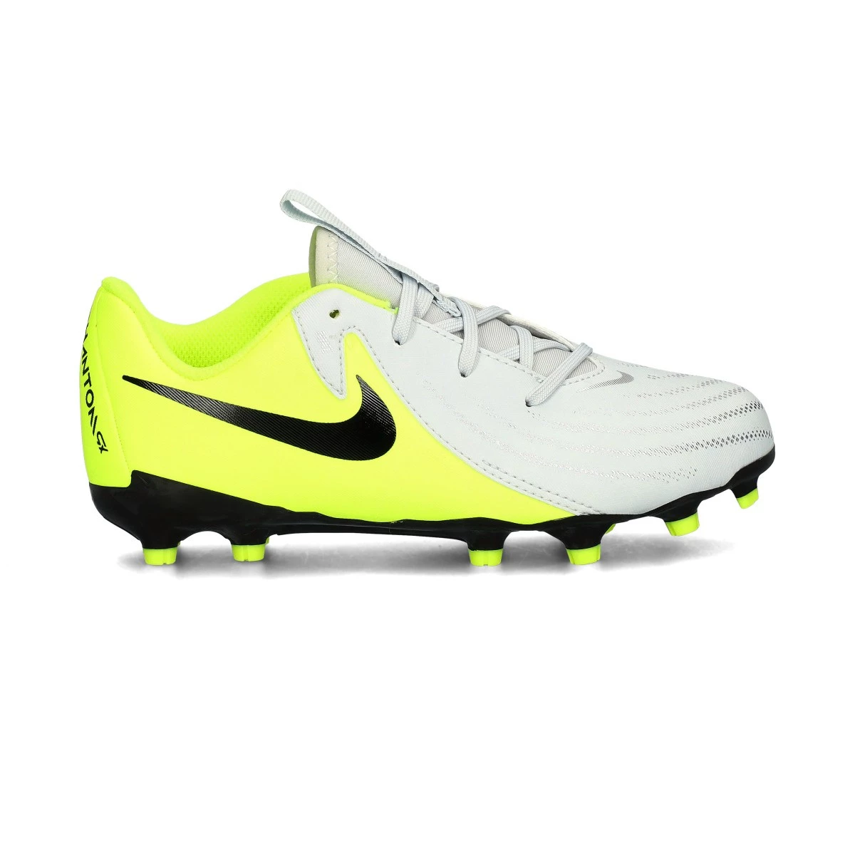 Chaussures de football Nike Phantom GX II Academy FG/MG pour enfants. Modèles de fil avec chaussette, à utiliser sur des terrains de gazon naturel sec ou humide. Chaussures de gamme haute pour joueurs de contrôle et de précision en couleur Mtlc Silver-Black-Volt.