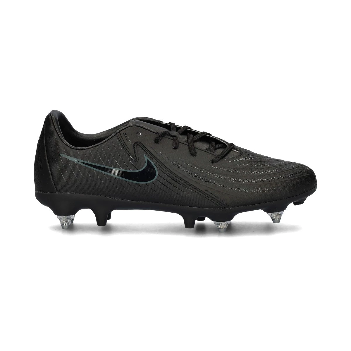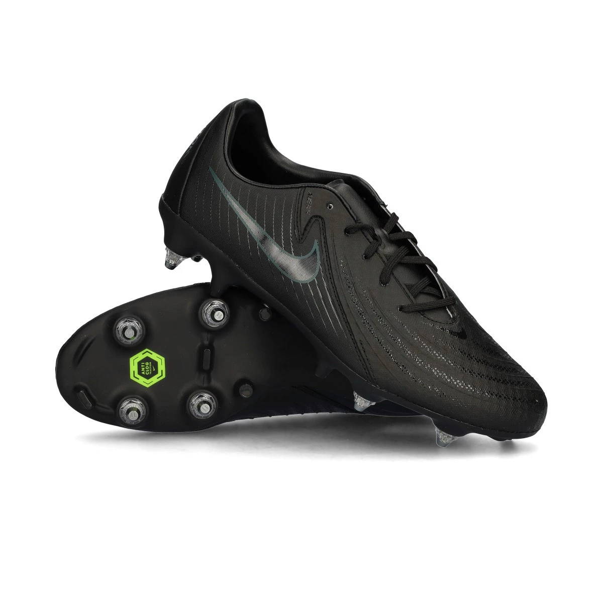 Chaussure de football Nike Phantom GX II Academy SG-Pro Anti-Clog pour adultes. Chaussures en fil conçues pour être utilisées sur des terrains en gazon naturel humide. Modèle d'entrée de gamme pour les joueurs de contrôle et de précision, en couleur Black-Black. La technologie spéciale Anti-Clog garantit qu'en absorbant l'eau, la surface de la semelle devient répulsive à la saleté.