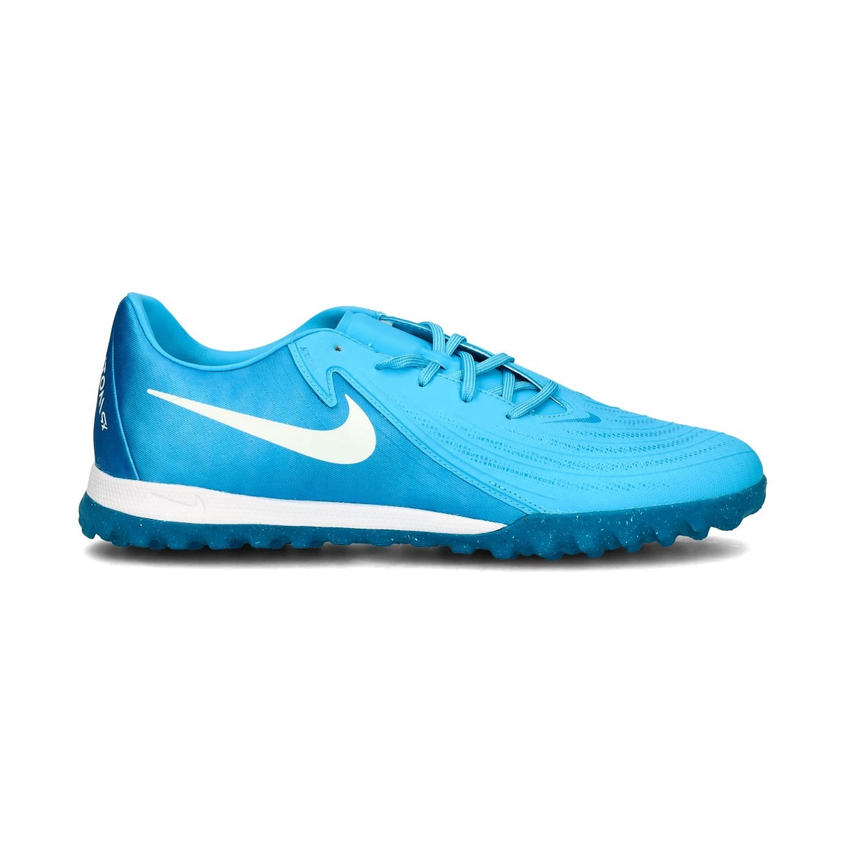 Chaussure de football Nike Phantom Gx II Academy Turf. Chaussures à lacets sans chaussettes, à utiliser sur des terrains en gazon artificiel de toute génération, en terre ou en béton. Chaussures de milieu de gamme pour les joueurs de contrôle et de précision en couleur Blue Fury-White