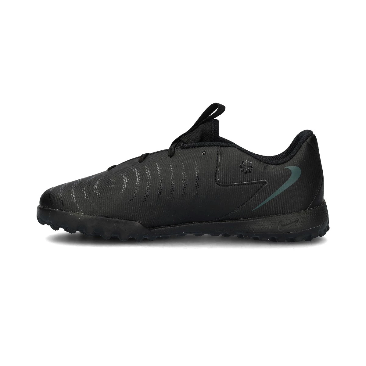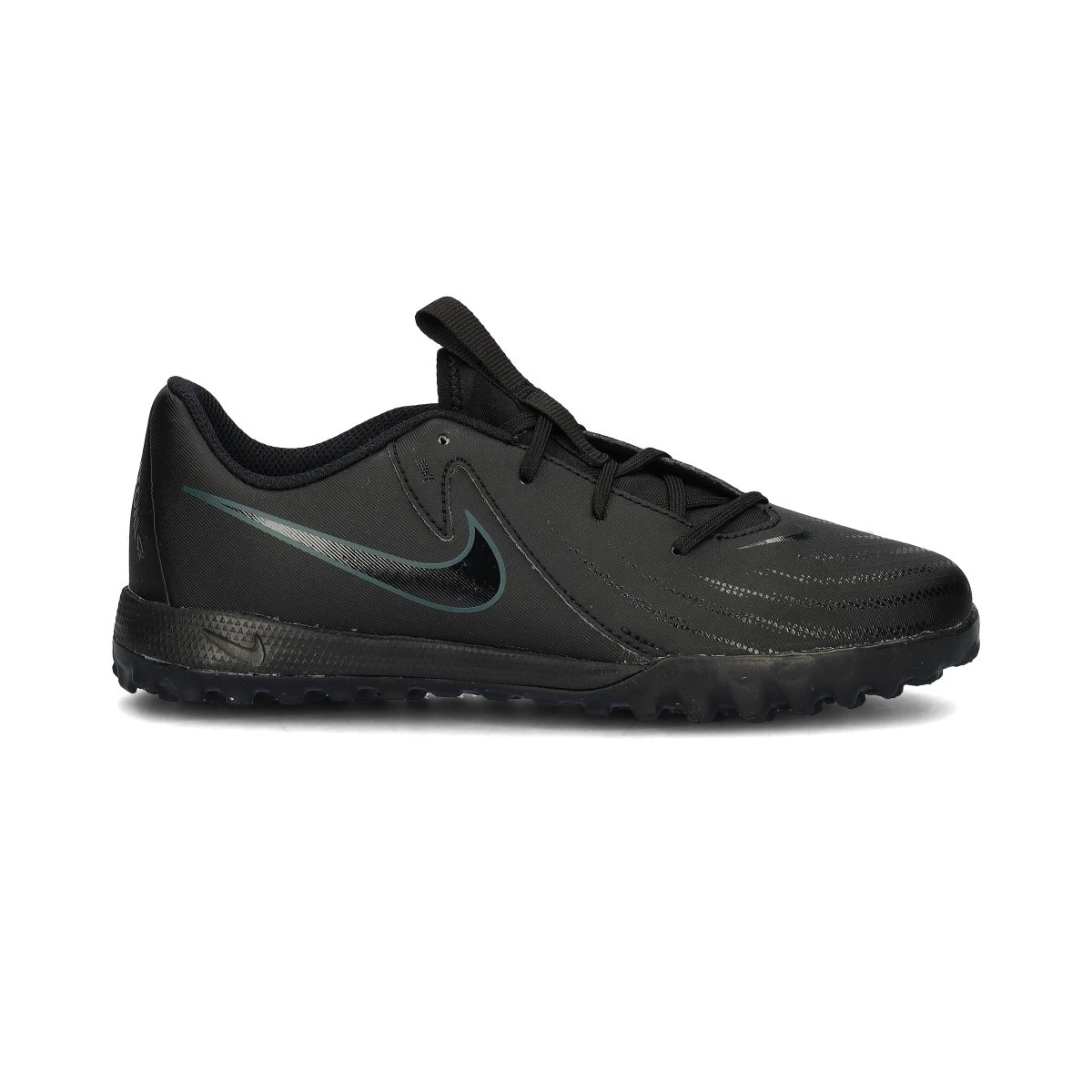 Chaussures de football Nike Phantom Gx II Academy Turf pour enfant. Chaussures à lacets pas montantes pour une utilisation sur toutes les générations de terrains en gazon artificiel, en terre ou en béton. Chaussures de milieu de gamme pour les joueurs de contrôle et de précision en Black-Black-Deep Jungle.
