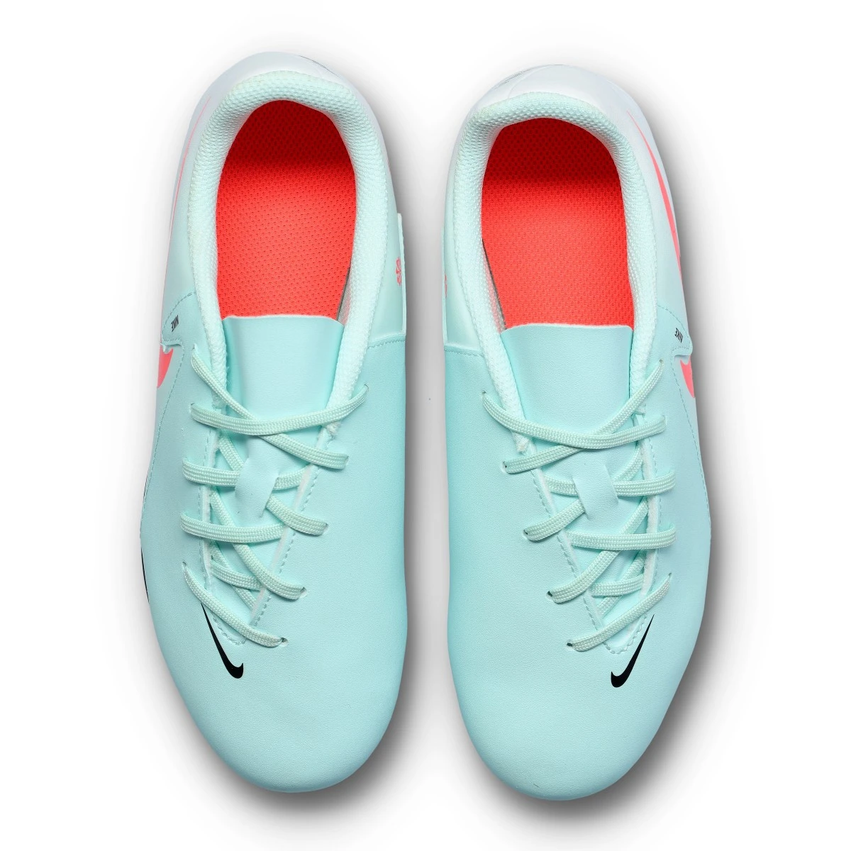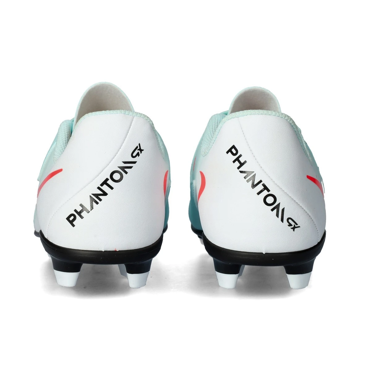 Chaussures de football Nike Phantom GX ll Club FG/MG pour enfants. Chaussure filetée avec chaussette, pour une utilisation sur des terrains en gazon naturel secs ou humides. Chaussures bas de gamme pour les joueurs de contrôle et de précision en couleur Mint-Atomic Red-Off Noir.