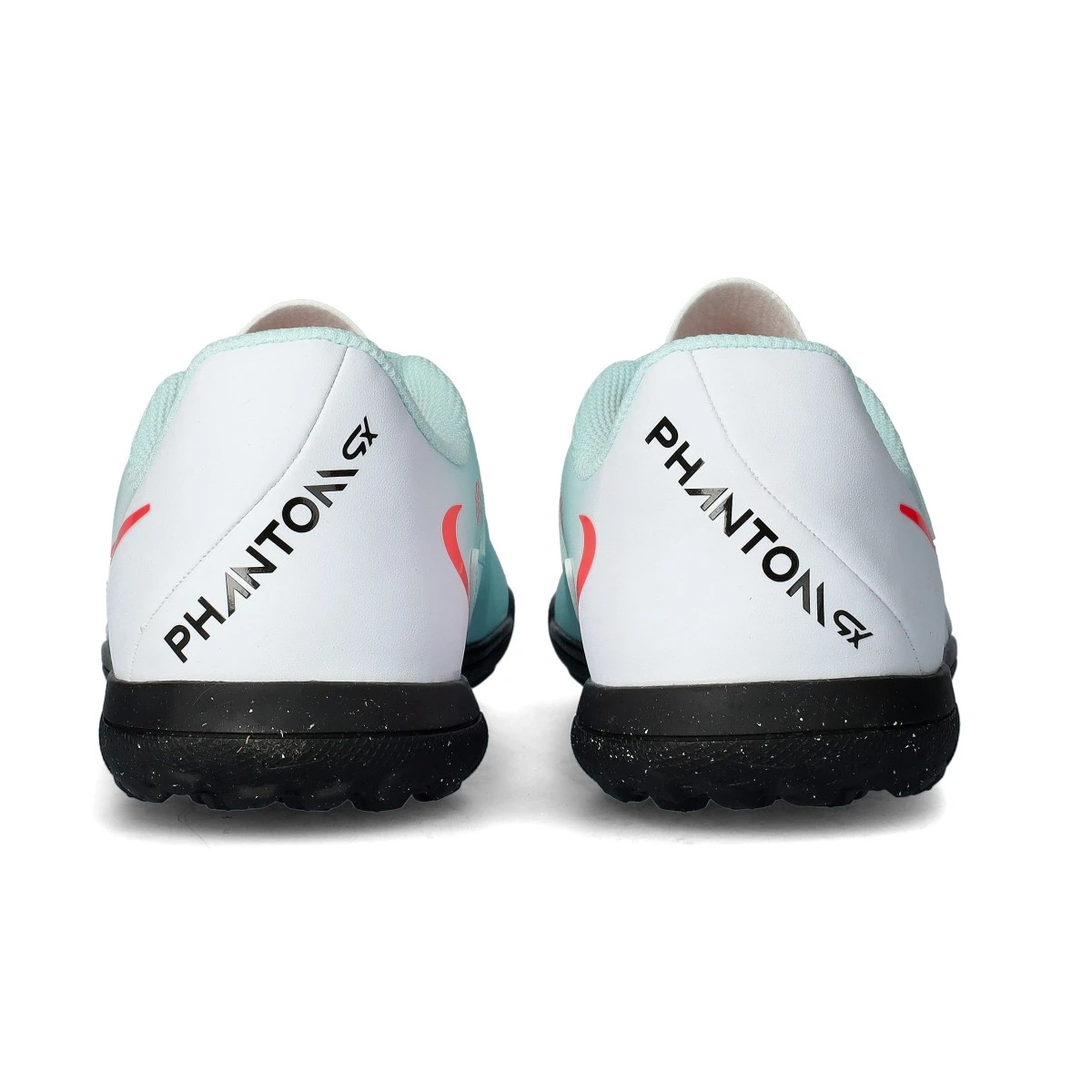 Chaussures de football Nike Phantom Gx II Club Turf pour enfants. Chaussures à lacets sans chaussettes, à utiliser sur toutes les générations de terrains en gazon artificiel, en terre battue ou en béton. Chaussures de milieu de gamme pour les joueurs de contrôle et de précision en Mint-Atomic Red-Off Noir.