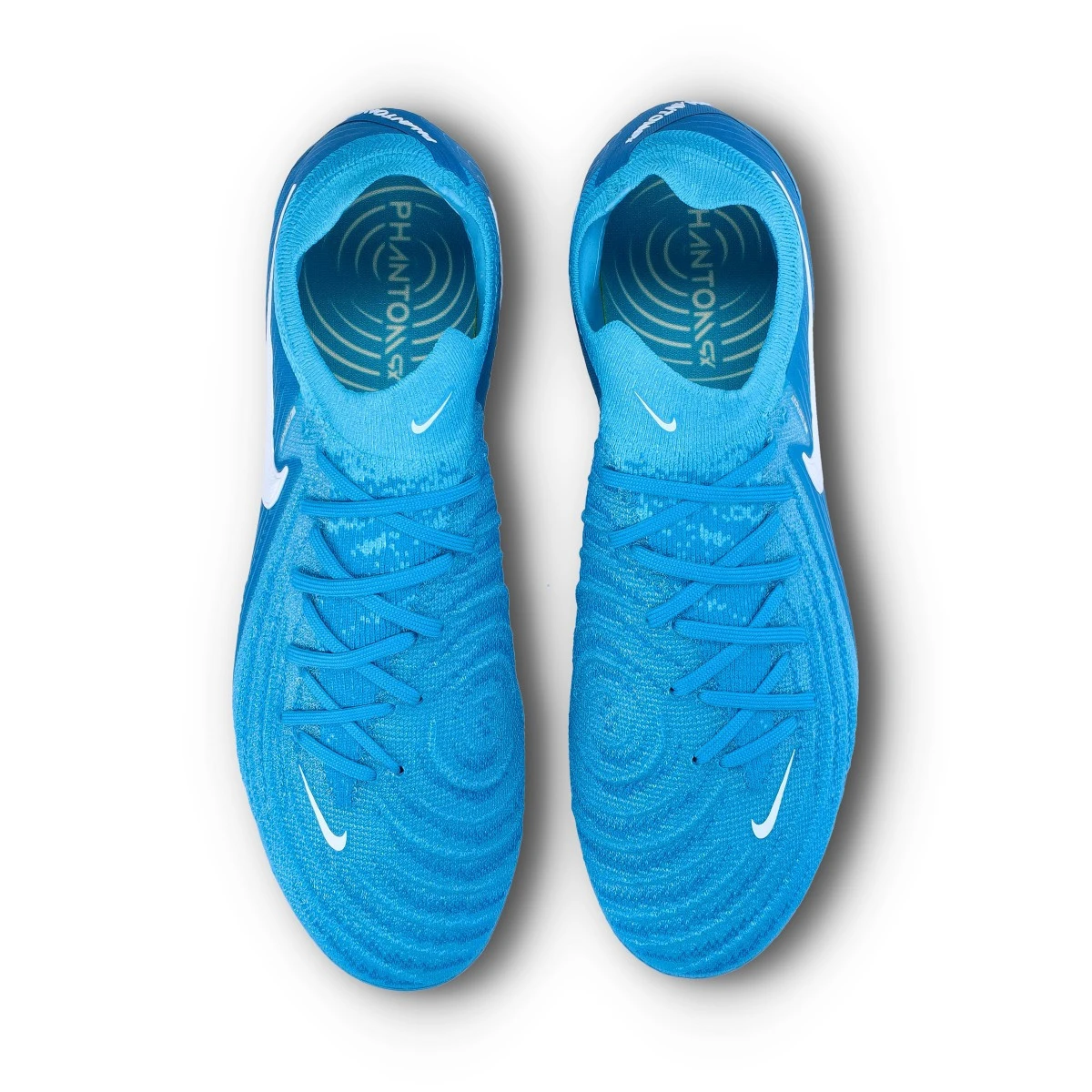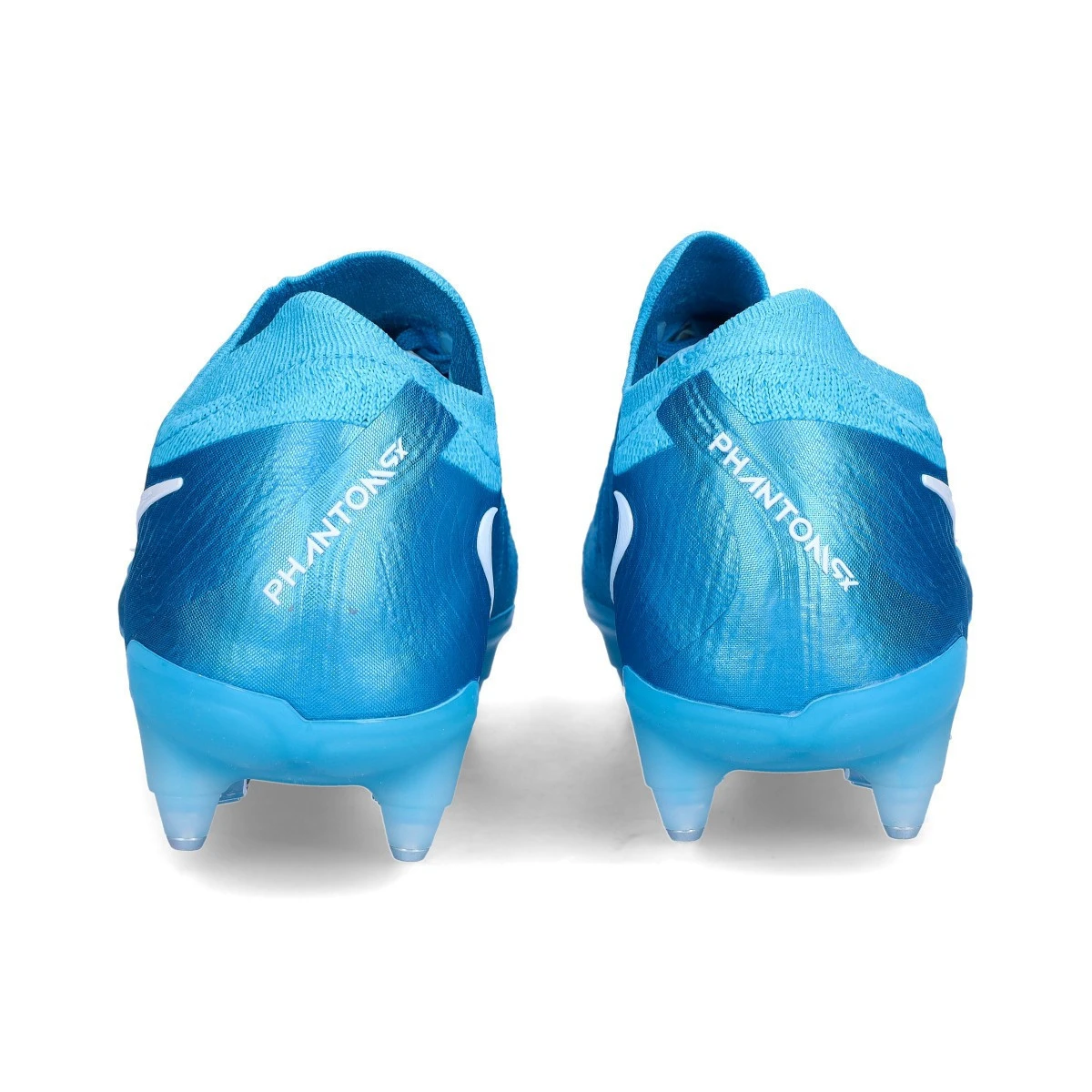 Chaussure de football Phantom GX II Elite SG-Pro pour adultes. Chaussure en fil conçue pour être utilisée sur des terrains en gazon naturel humide ou des surfaces souples. Chaussures haut de gamme pour les joueurs de contrôle et de précision, en couleur Blue Fury-White.