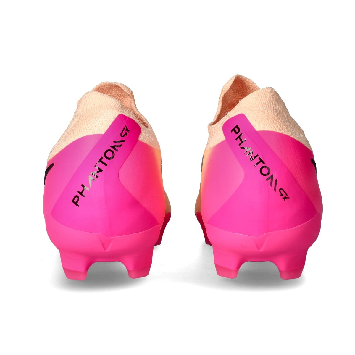 Chaussures de football Nike Phantom GX ll Pro FG pour adultes. Chaussure à chaussettes, à utiliser sur des terrains en gazon naturel secs ou humides. Chaussures haut de gamme pour les joueurs de contrôle et de précision en couleur Crimson Tint-Black-Pink Blast.