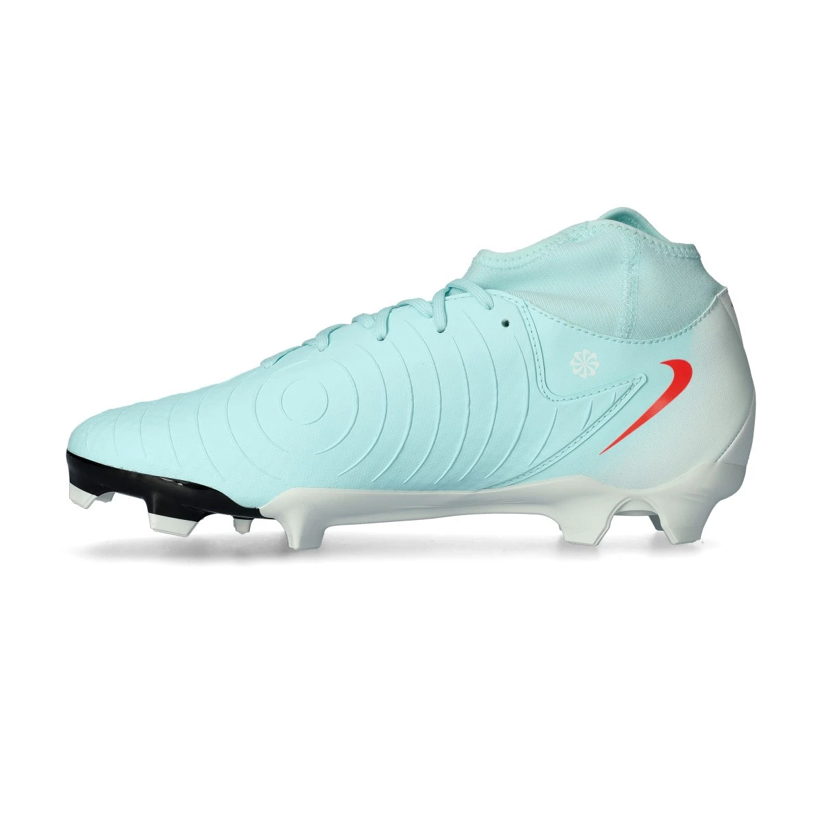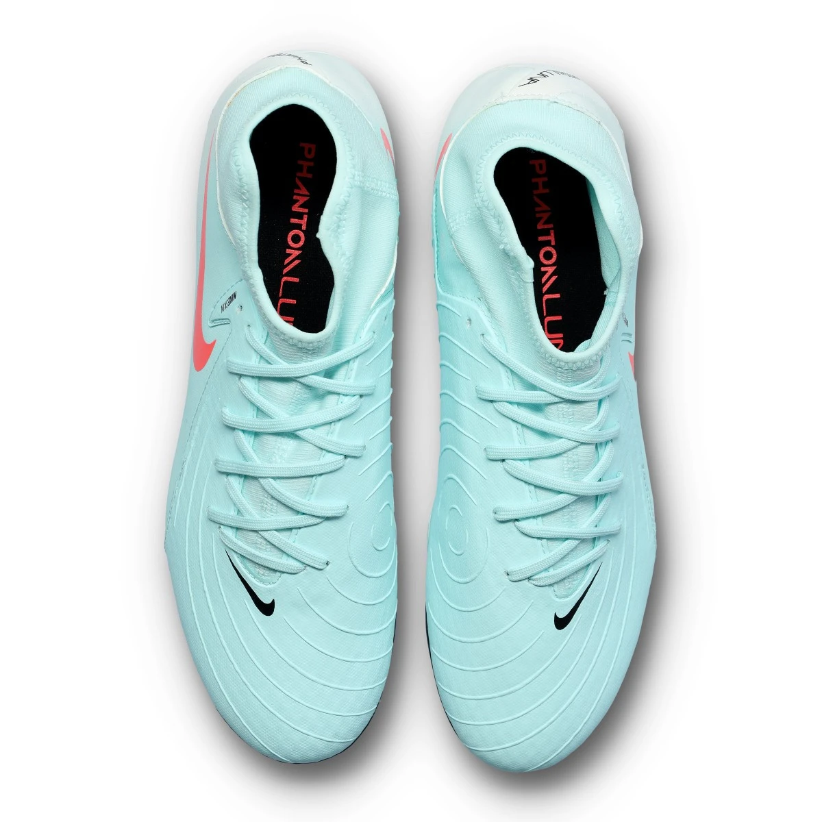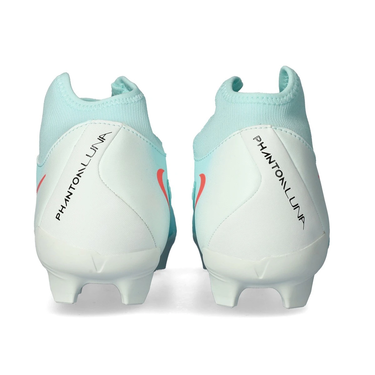 Chaussures de football Nike Phantom Luna II Academy FG/MG. Chaussures à chaussettes, à utiliser sur gazon naturel sec ou humide ou sur gazon artificiel. Chaussures bas de gamme pour les joueurs de contrôle et de précision en couleur Mint-Atomic Red-Off Noir.