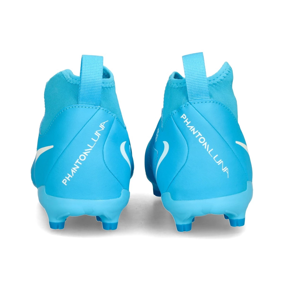 Chaussures de football Nike Phantom Luna II Academy FG/MG pour enfant. Une chaussure à lacets, à utiliser sur les terrains en gazon naturel secs ou mouillés. Chaussure de milieu de gamme pour les joueurs de contrôle et de précision en Blue Fury-White.