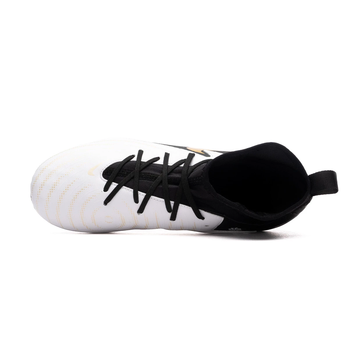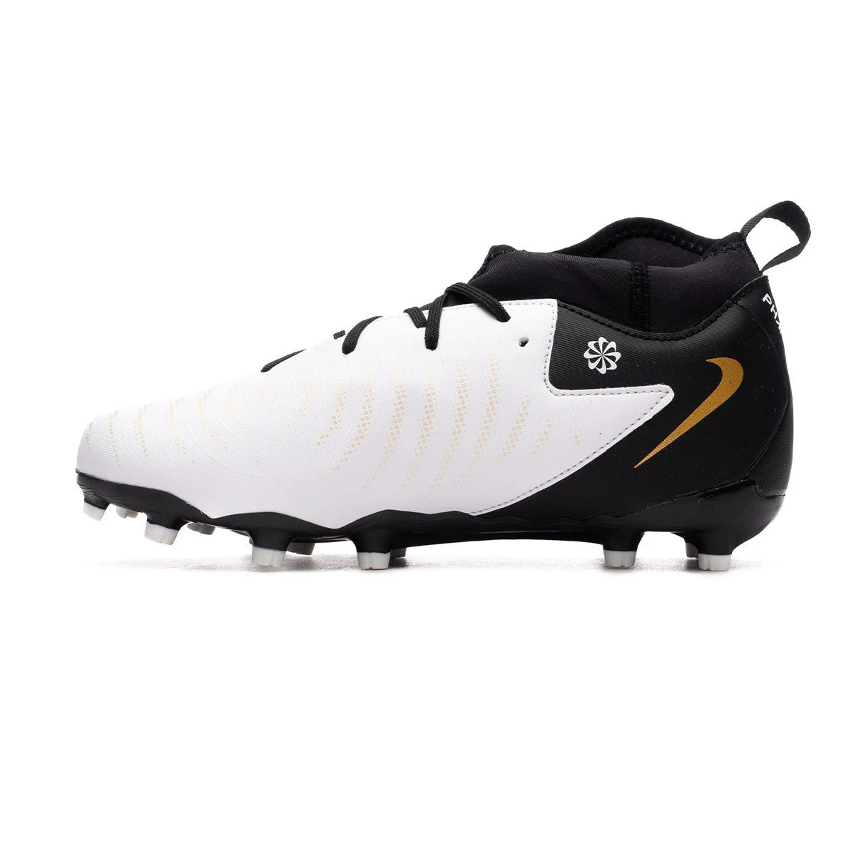 Chaussures de football Nike Phantom Luna II Academy FG/MG pour enfants. Chaussure à chaussettes, à utiliser sur des terrains en gazon naturel secs ou mouillés. Chaussures de milieu de gamme pour les joueurs de contrôle et de précision, coloris White-Black-Mtlc Gold Coin.