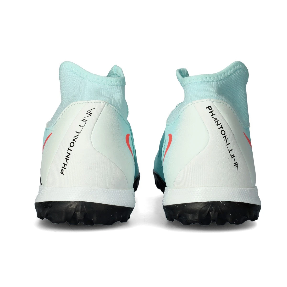Chaussure de football Nike Phantom Luna II Academy Turf. Une chaussure à chaussettes, pour une utilisation sur des terrains en moquette ou en gazon artificiel. Chaussures bas de gamme pour les joueurs de contrôle et de précision en couleur Mint-Atomic Red-Off Noir.