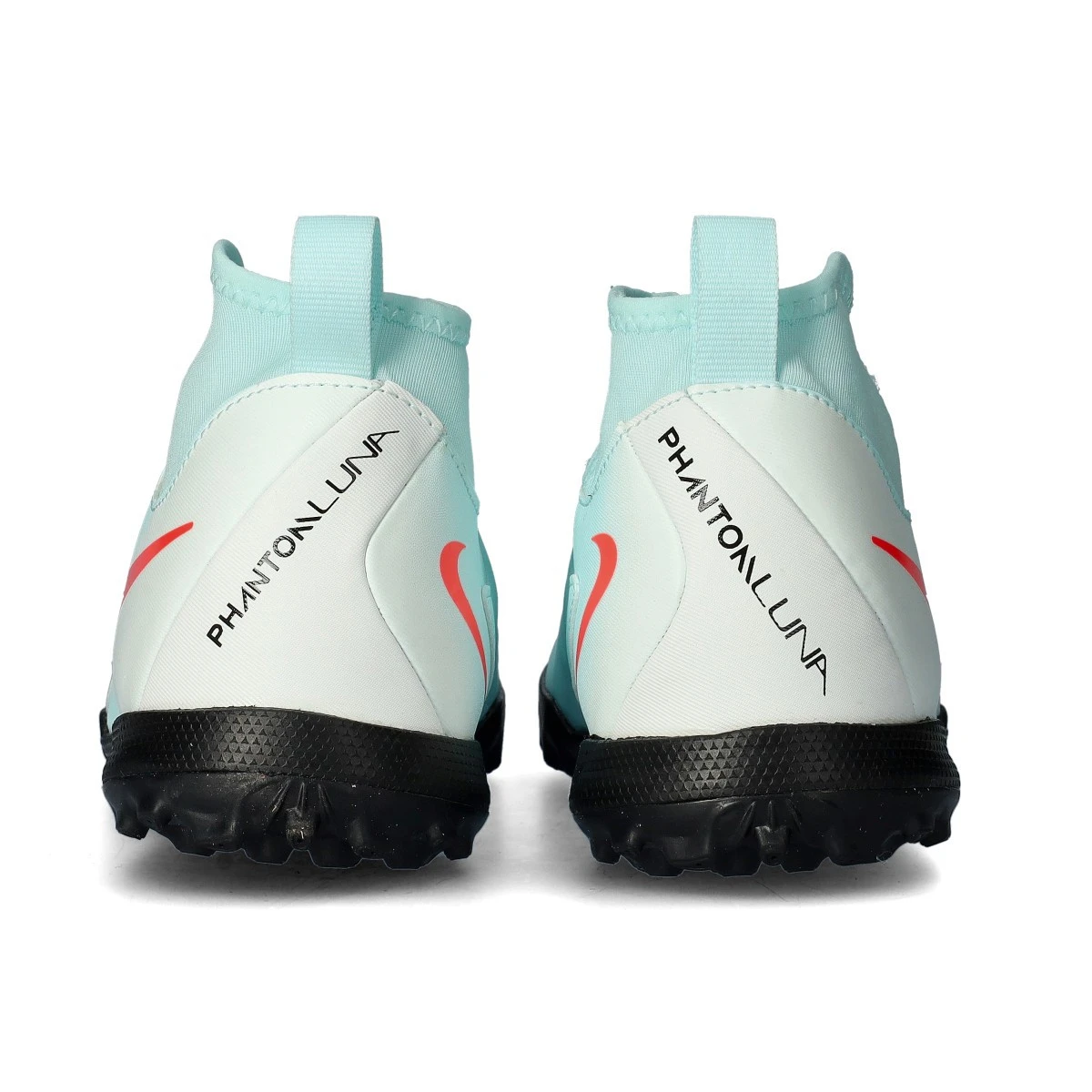 Chaussure de football Nike Phantom Luna II Academy Turf. Une chaussure à chaussettes, pour une utilisation sur des terrains en moquette ou en gazon artificiel. Chaussures bas de gamme pour les joueurs de contrôle et de précision en couleur Mint-Atomic Red-Off Noir.