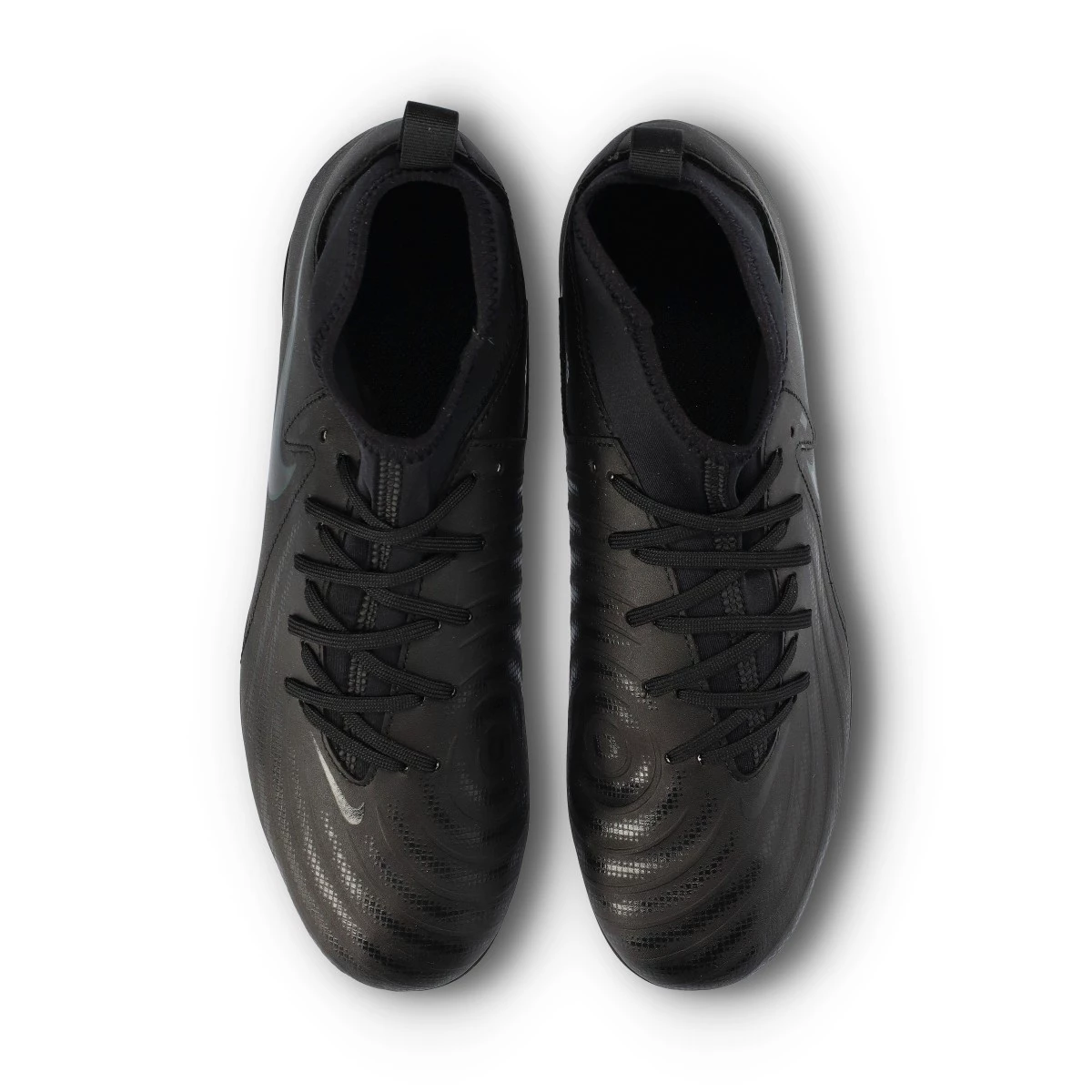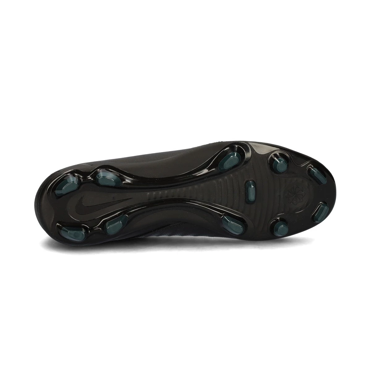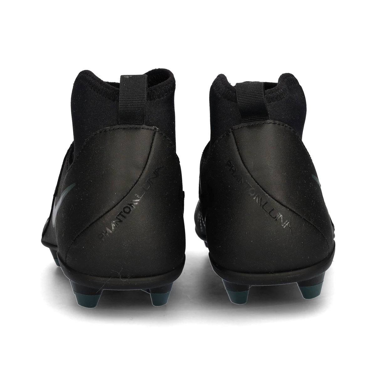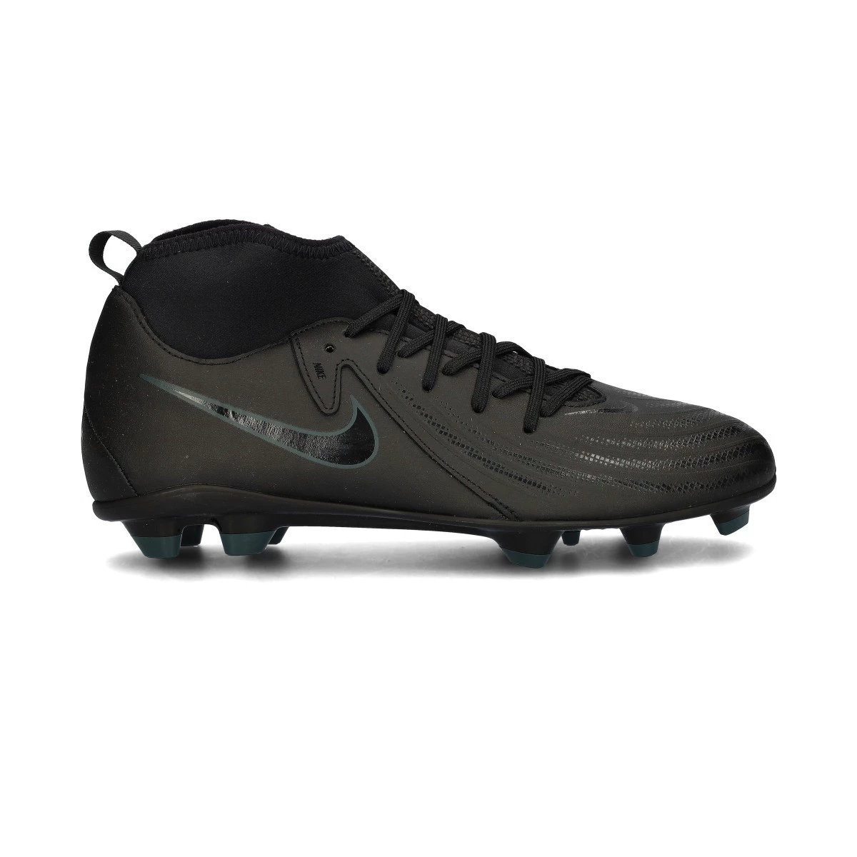 Chaussures de football Nike Phantom Luna II Club FG/MG. Chaussure filetée avec chaussette, à utiliser sur des terrains en gazon naturel secs ou humides. Chaussures de la gamme de base pour les joueurs de contrôle et de précision, en Black-Black-Deep Jungle.