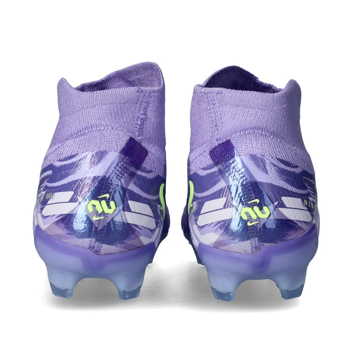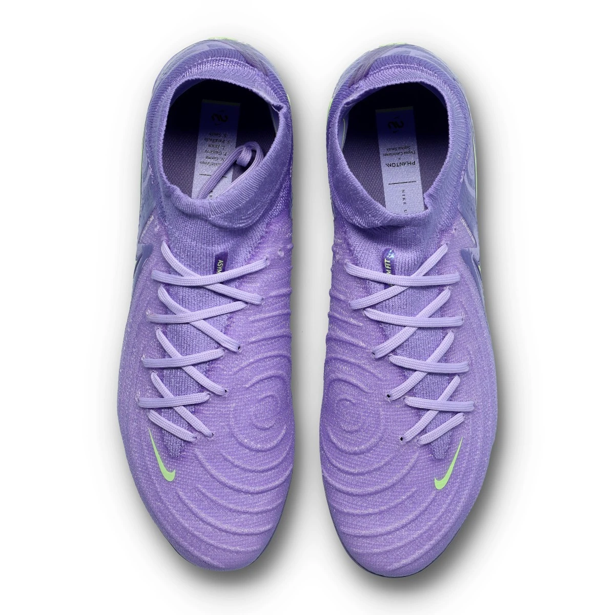 Chaussures de football Nike Phantom Luna ll Elite FG pour adultes. Chaussure à chaussettes, à utiliser sur des terrains en gazon naturel secs ou mouillés. Chaussures haut de gamme pour les joueurs de contrôle et de précision en Purple Agate-Barely Volt.