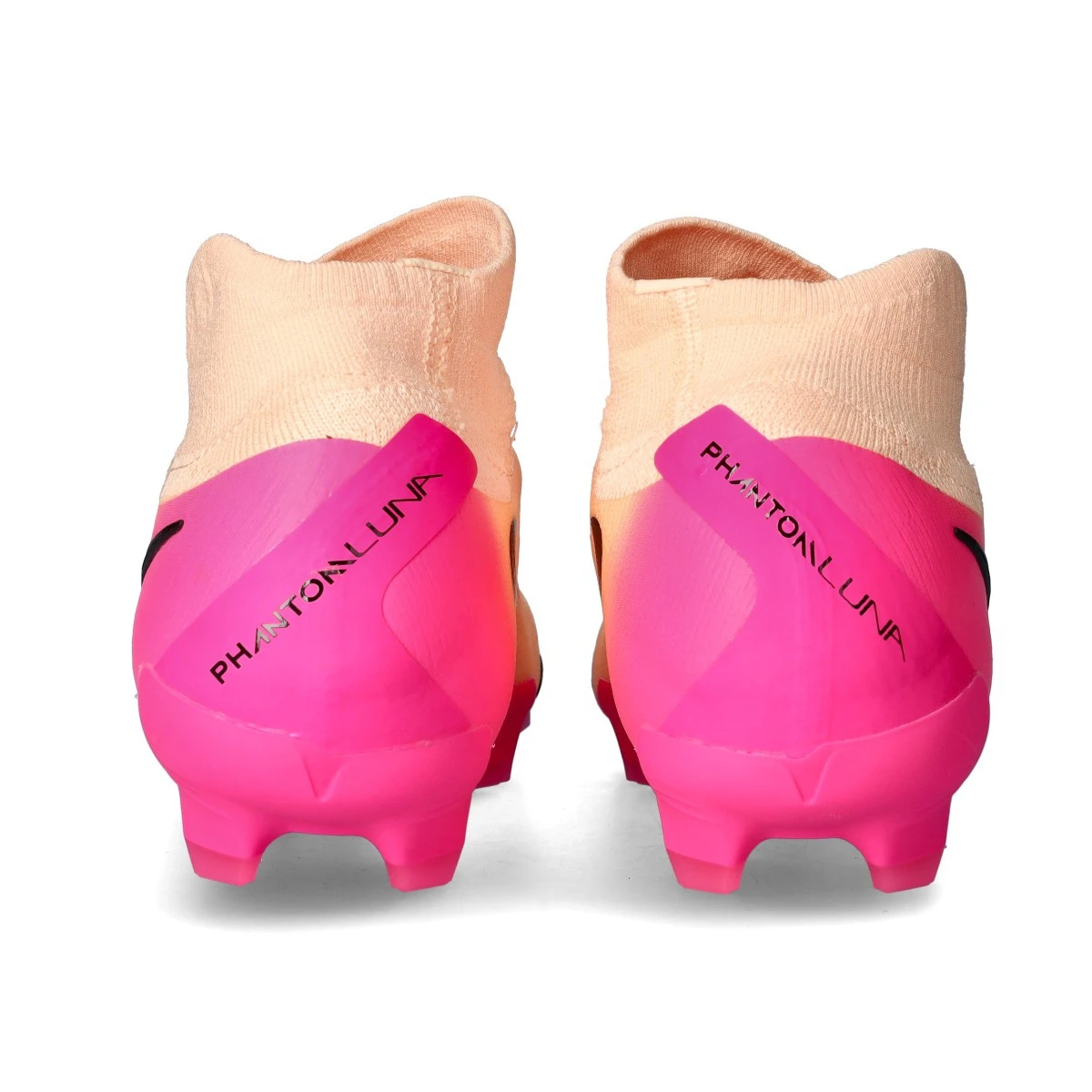 Chaussures de football Nike Phantom Luna ll Pro FG pour adultes. Chaussures à chaussettes, à utiliser sur des terrains en gazon naturel secs ou humides. Chaussures haut de gamme pour les joueurs de contrôle et de précision en couleur Crimson Tint-Black-Pink Blast.