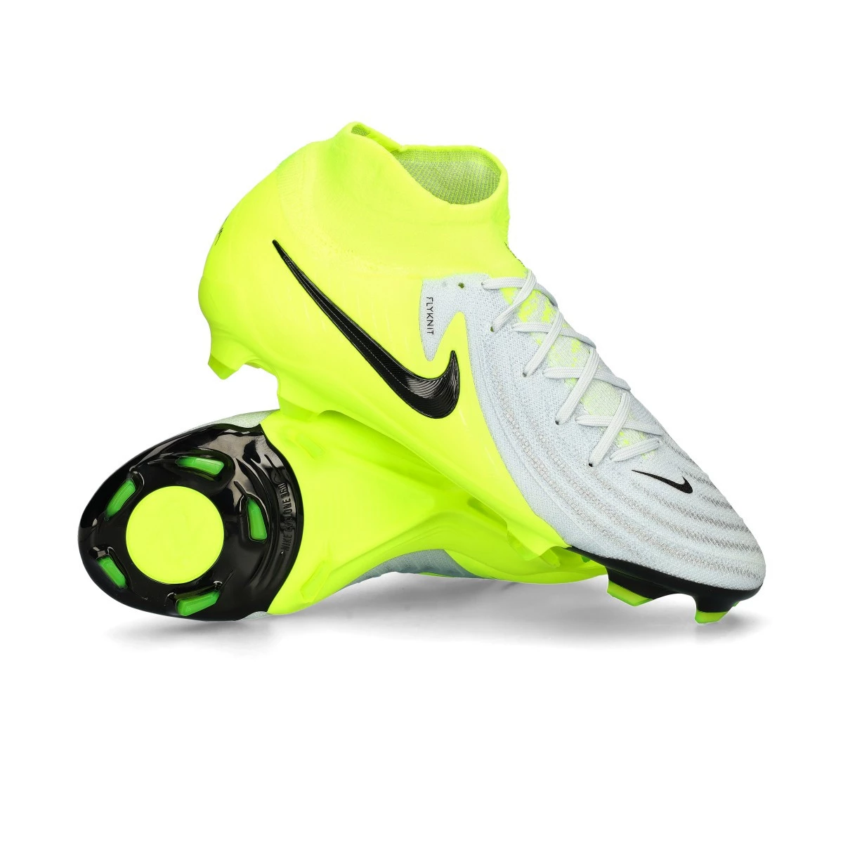 Chaussures de football Nike Phantom Luna ll Pro FG pour adultes. Chaussure à chaussettes, à utiliser sur des terrains en gazon naturel secs ou mouillés. Chaussure haut de gamme pour les joueurs de contrôle et de précision en couleur Mtlc Silver-Black-Volt.