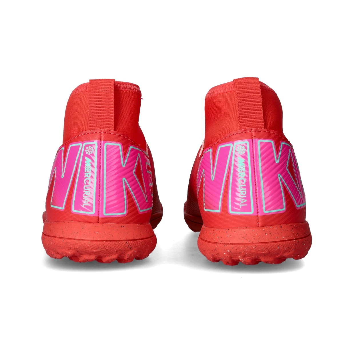 Chaussure de football Nike Mercurial Superfly 10 Club Turf. Tige synthétique avec doublure en chaussette pour une utilisation sur moquette, gazon artificiel ou terrains en béton. Chaussure d'entrée de gamme en Ember Glow-Aurora Green.