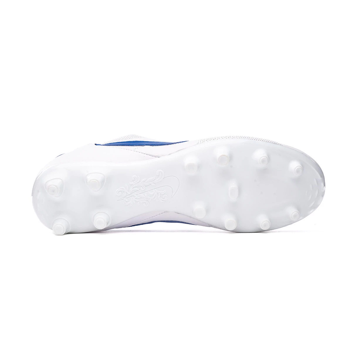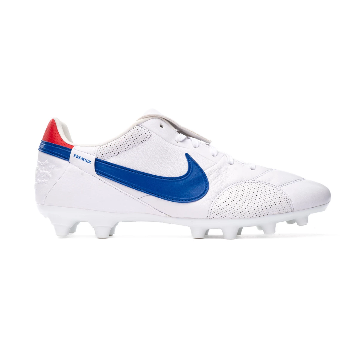 Chaussure de football Nike Premier 3 FG pour adulte. Chaussures en cuir de kangourou, à utiliser sur les terrains en gazon naturel secs ou humides. Chaussures haut de gamme de couleur White-Game Royal-University Red.