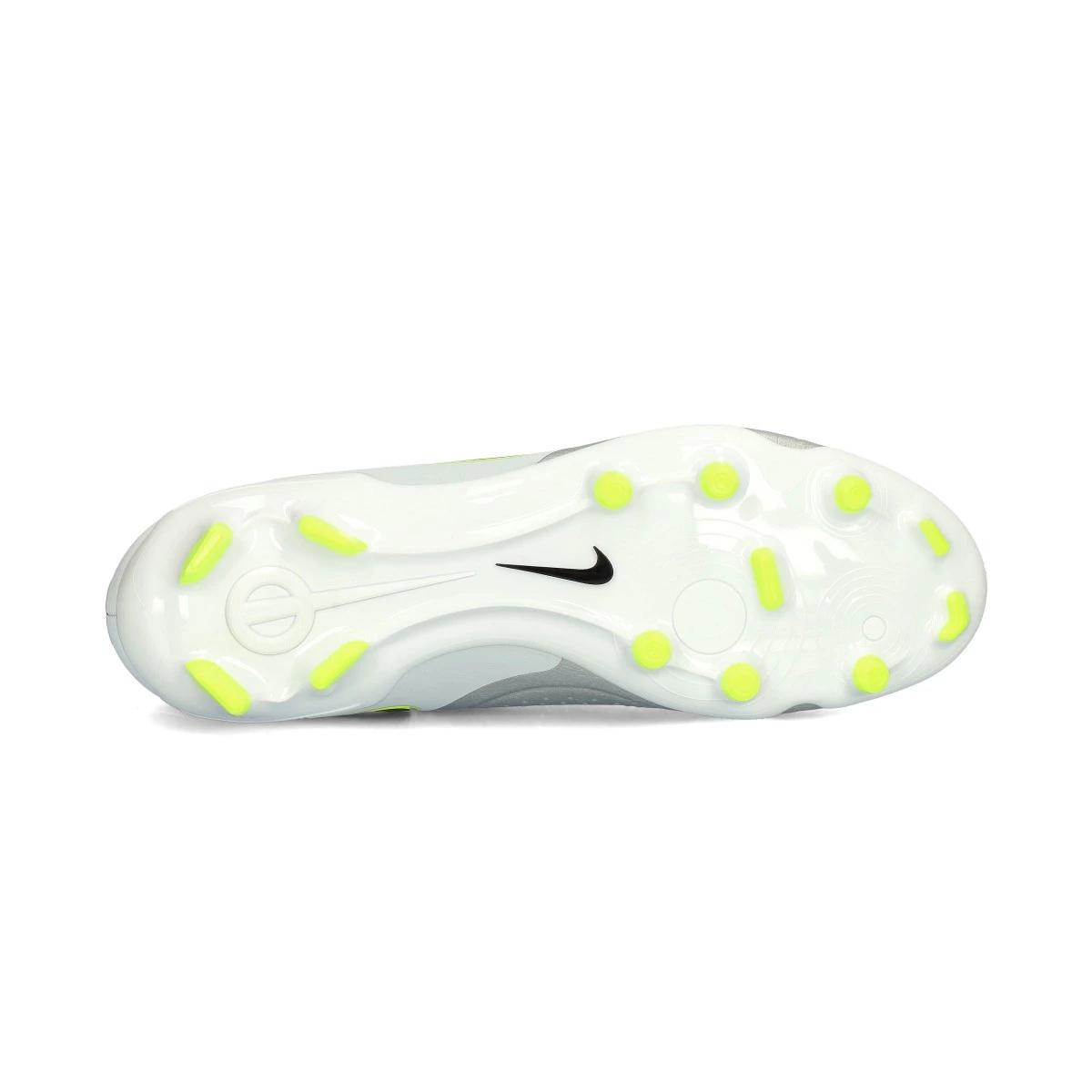 Chaussures de football Nike Legend 10 Academy FG/MG. Chaussures en cuir FlyTouch Plus, à utiliser sur des terrains en gazon naturel ou artificiel. Chaussures de gamme débutant en couleur Mtlc Silver-Black-Volt.