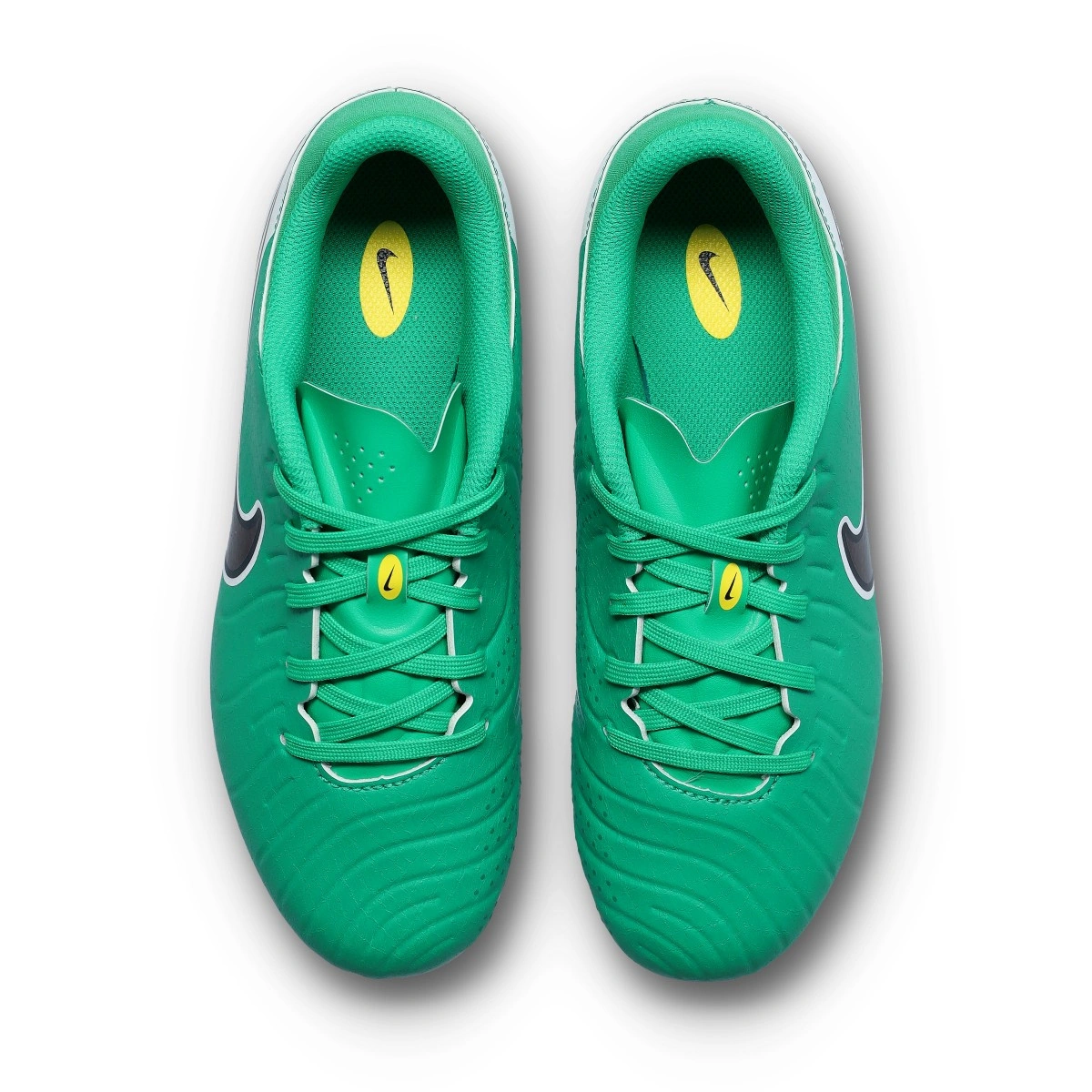 Chaussures de football Nike Legend 10 Academy FG/MG pour enfants. Chaussures en cuir FlyTouch Plus, à utiliser sur des terrains en gazon naturel ou artificiel. Chaussures d'entrée de gamme en couleur Stadium Green-Dk Obsidian.