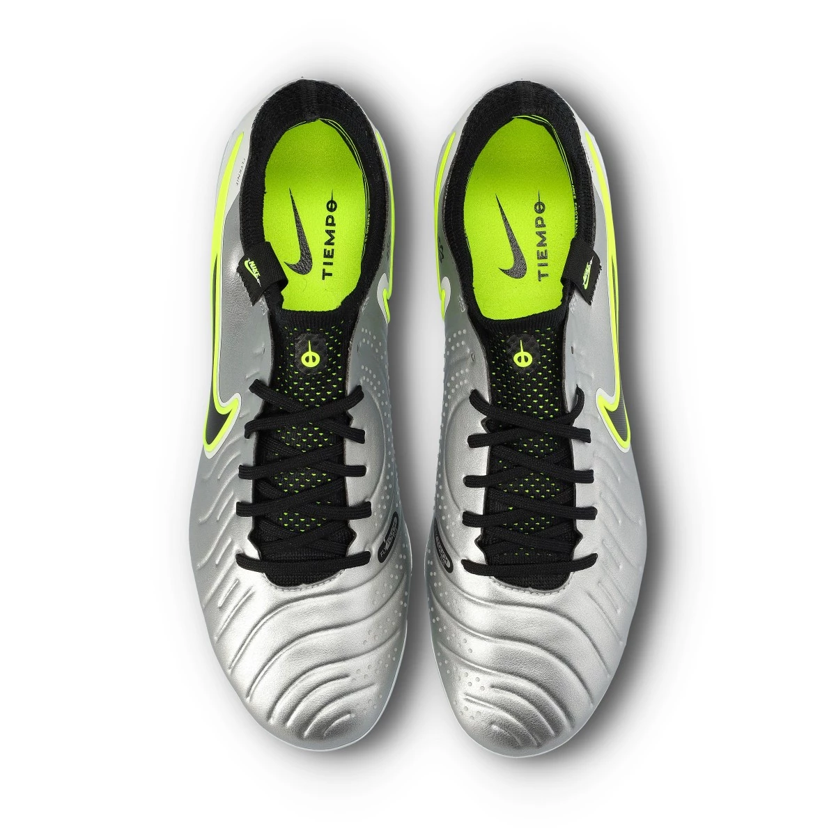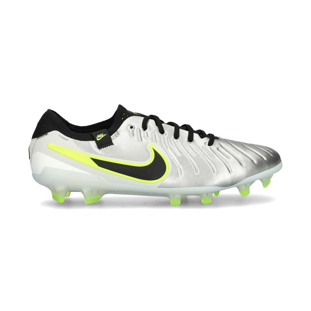 Chaussures de football Nike Tiempo Legend 10 Elite FG. Des chaussures qui intègrent le nouveau cuir Flytouch Plus amélioré, pour une utilisation sur des terrains en gazon naturel secs ou humides. Des chaussures haut de gamme en Mtlc Silver-Black-Volt