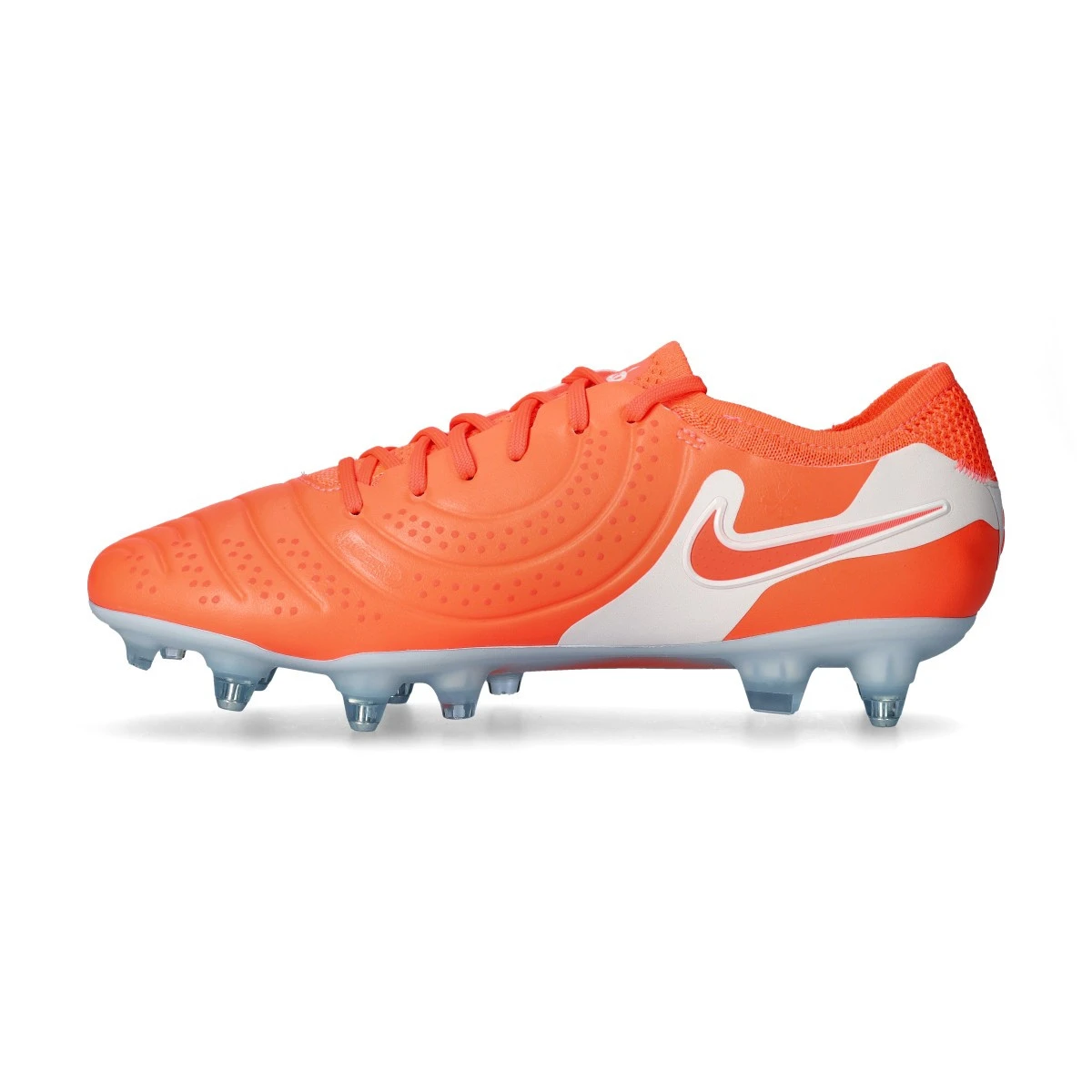 Chaussures de football Nike Tiempo Legend 10 Elite SG-Pro AC. Chaussures dotées du nouveau cuir Flytouch Plus amélioré, pour une utilisation sur des terrains en gazon naturel mouillé. Chaussures haut de gamme en couleur Hot Lava-White.