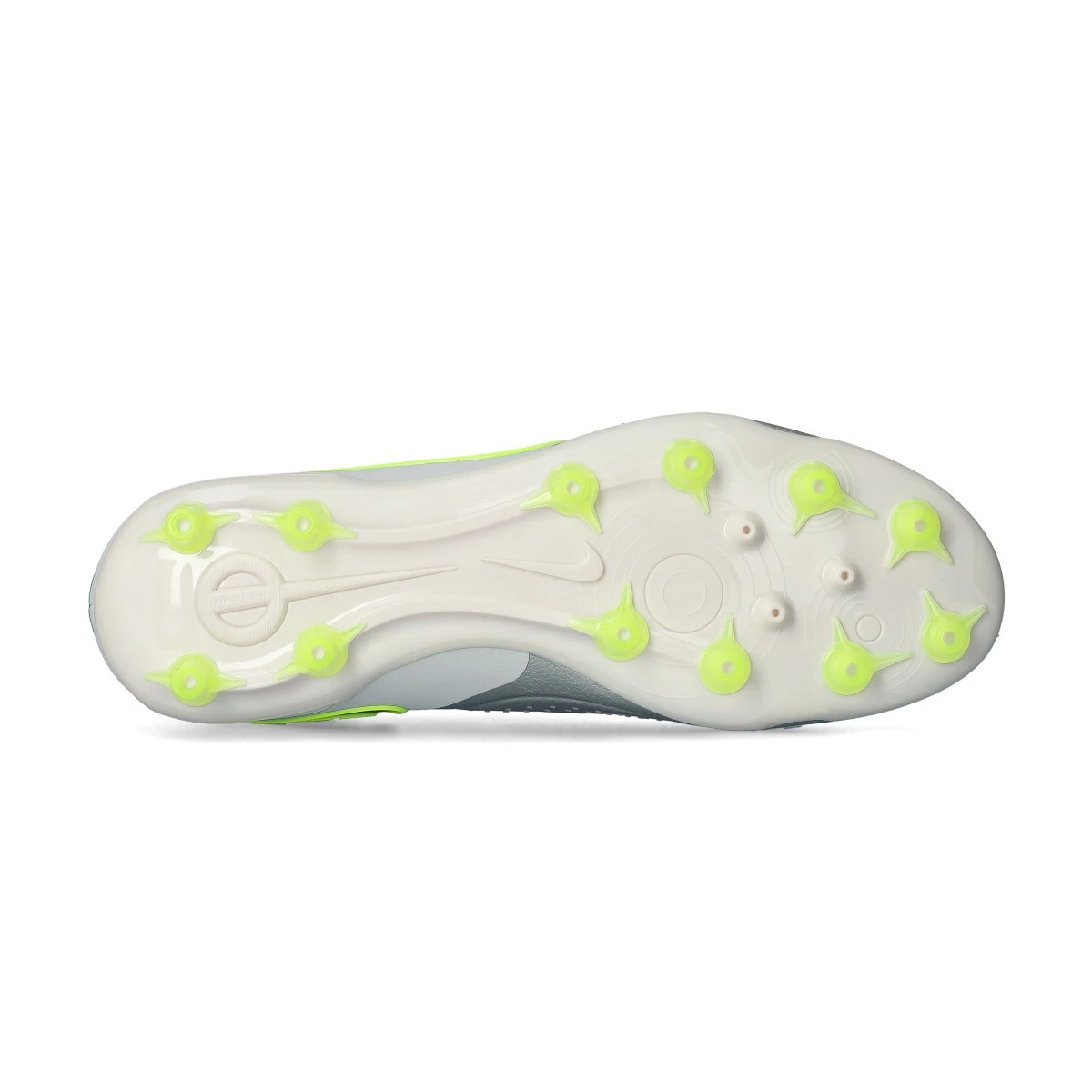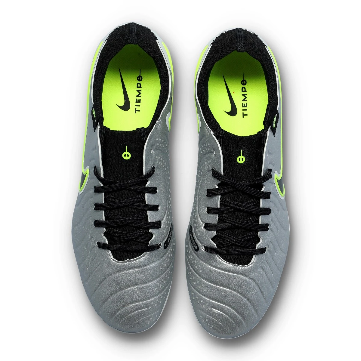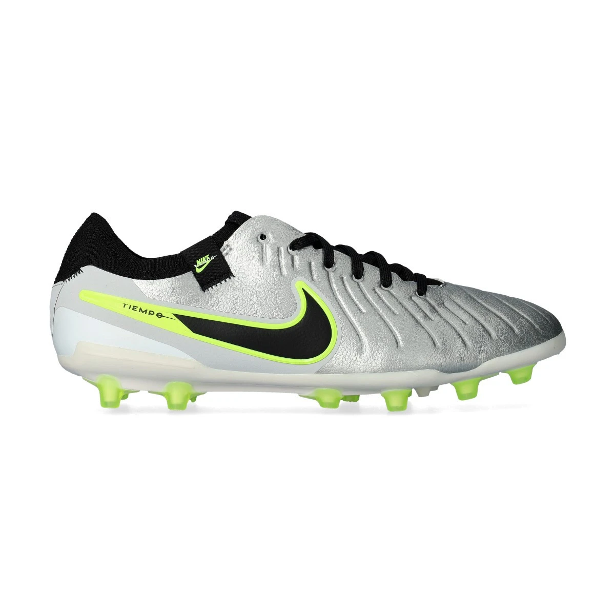 Chaussures de football Nike Tiempo Legend 10 Pro AG pour adultes. Modèles destinés à être utilisées sur des terrains en gazon artificiel. Chaussures de milieu de gamme en couleur Mtlc-Silver-Black-Volt.