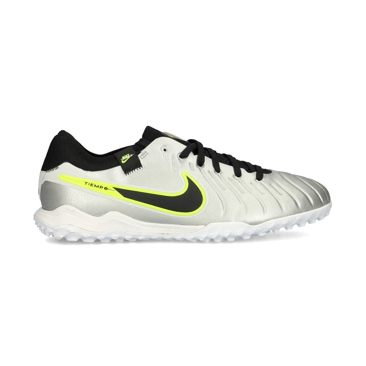 Chaussures de football Nike Tiempo Legend 10 Pro Turf. Modèles à utiliser sur gazon artificiel, moquette ou terrains en béton. Chaussure de milieu de gamme en couleur Mtlc Silver-Black-Volt.