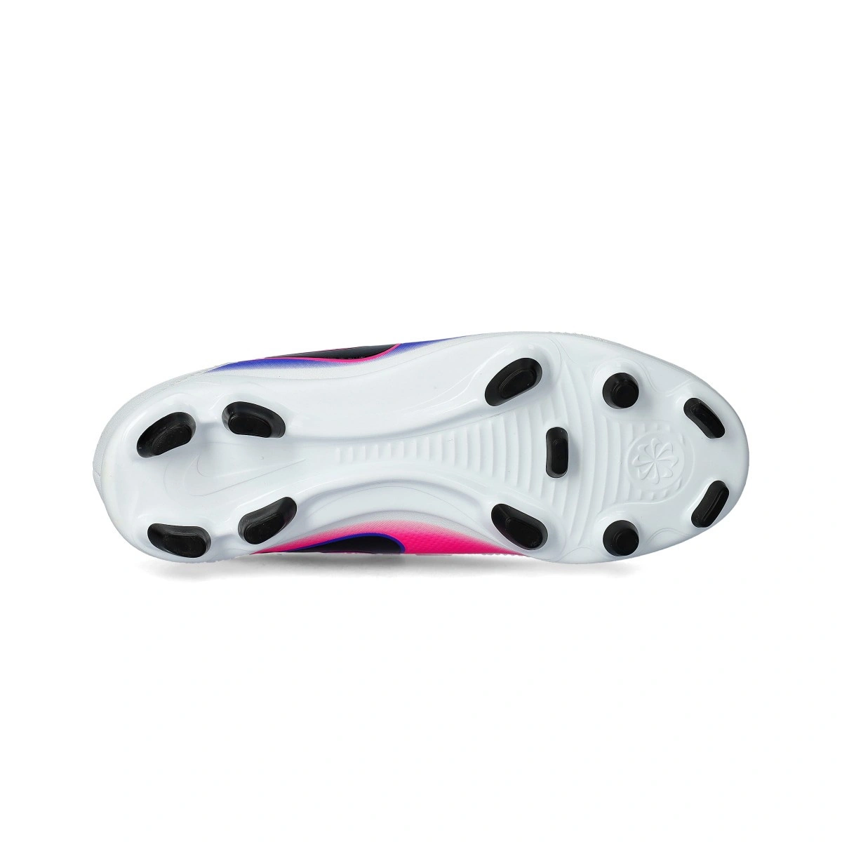 Chaussure de football Nike Tiempo Maestro Club FG/MG pour enfant. Chaussures en cuir synthétique, pour terrains en herbe naturelle ou artificielle. Chaussures d'entrée de gamme en couleur White-Black-Racer Blue-Pink Blast.