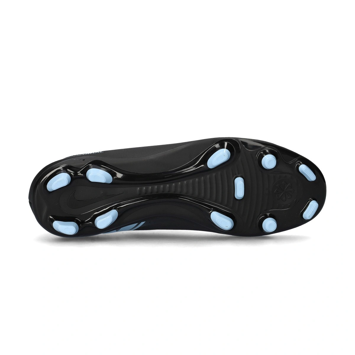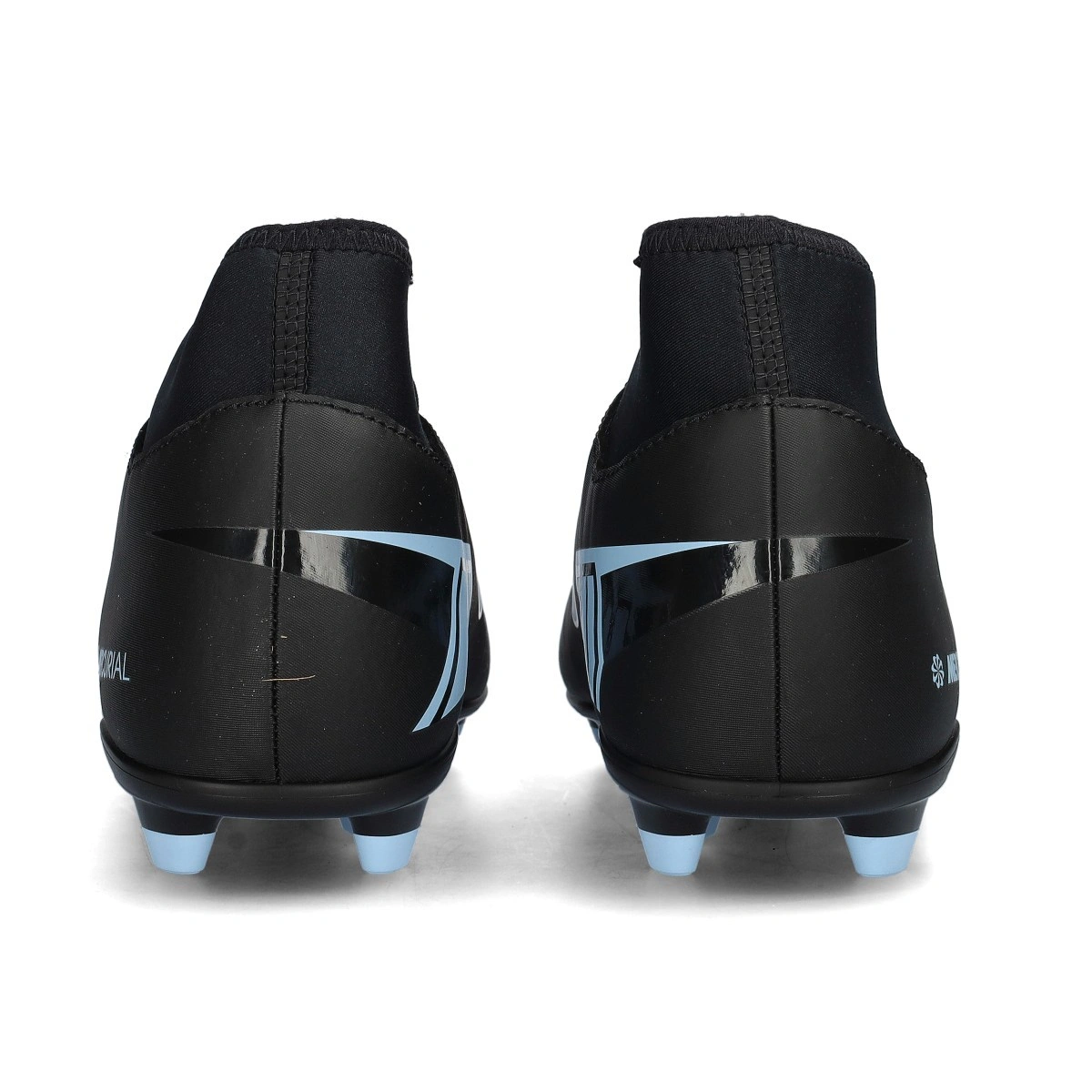Chaussures synthétiques avec chausson, conçues pour les terrains en gazon naturel sec ou humide, ainsi que pour les terrains en gazon artificiel de toutes générations et/ou terrains en terre. Modèle d’entrée de gamme en coloris Black-Ice Blue