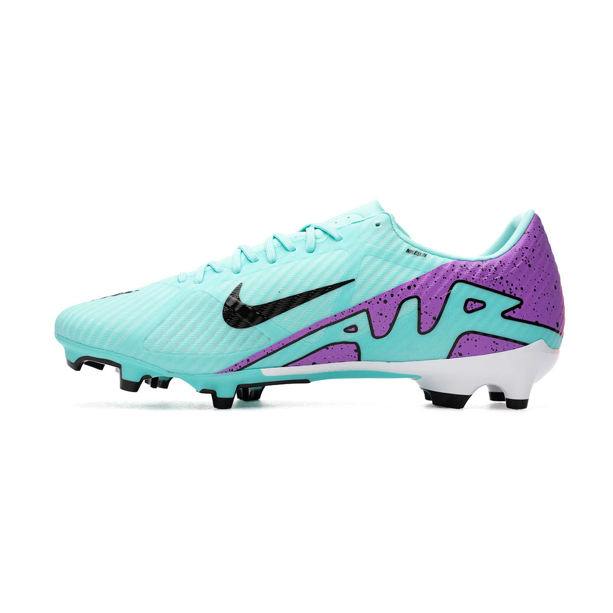 Chaussures de football Nike Zoom Mercurial Vapor XV Academy FG/MG. Chaussures en fil, à utiliser sur les terrains en gazon artificiel de toute génération. Chaussures de milieu de gamme en Hyper Turq-Fuchsia Dream-Black-White.