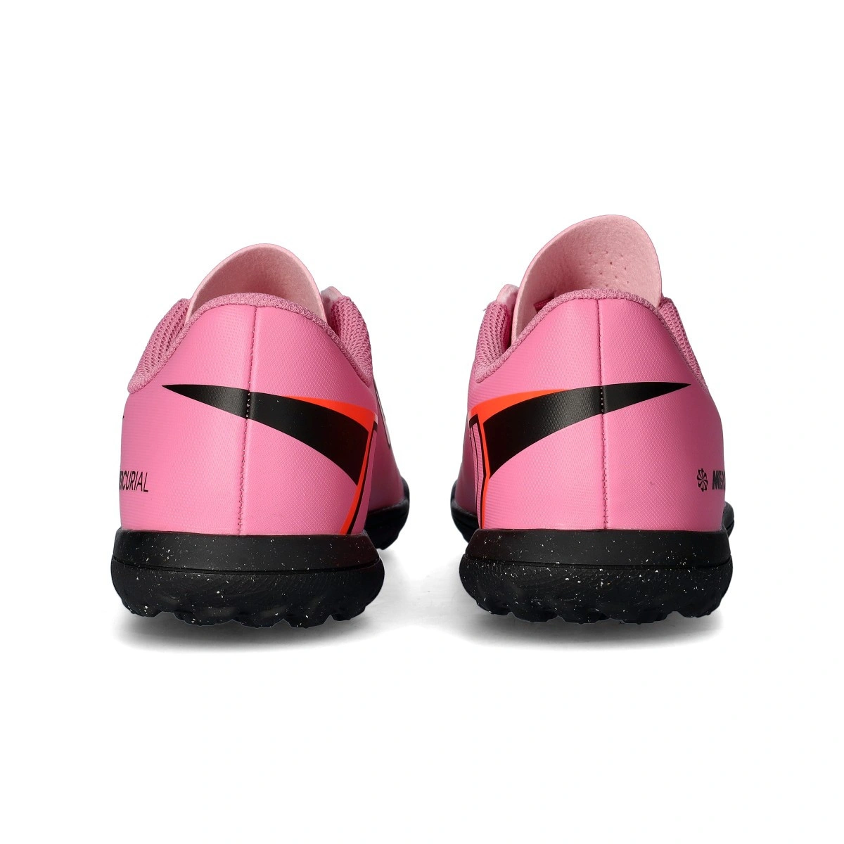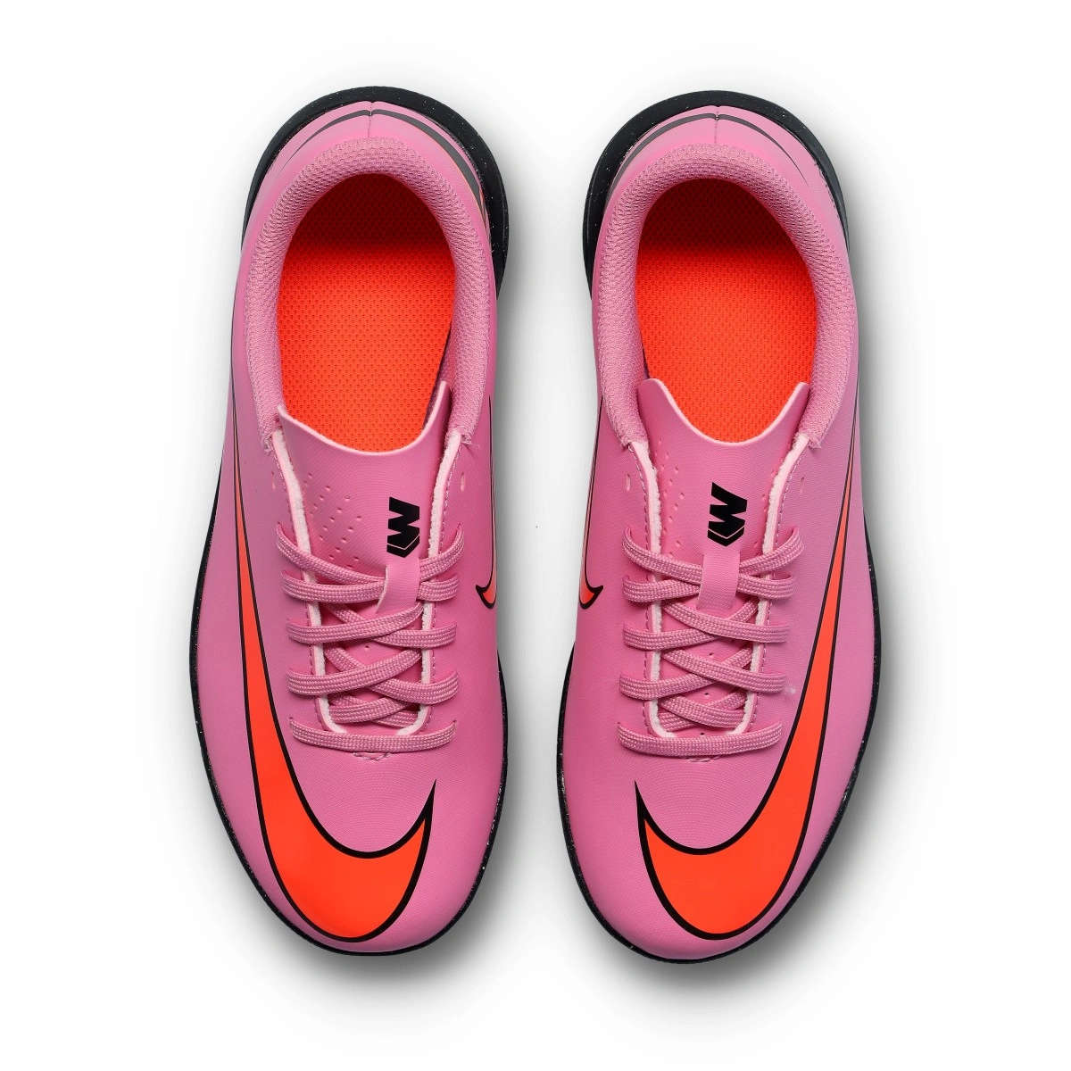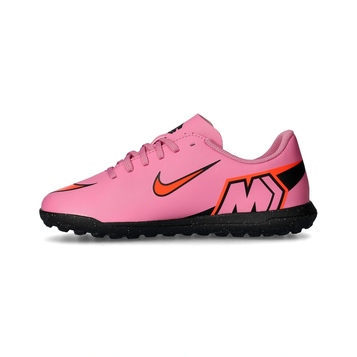 Chaussures de football Nike Zoom Mercurial Vapor 16 Club Turf pour enfant. Chaussures en maille, sans chaussette intégrée, conçues pour jouer sur gazon synthétique, moquette ou surfaces en ciment. Modèle d’entrée de gamme pensé pour les joueurs rapides, en coloris Magic Flamingo – Black – Total Crimson.