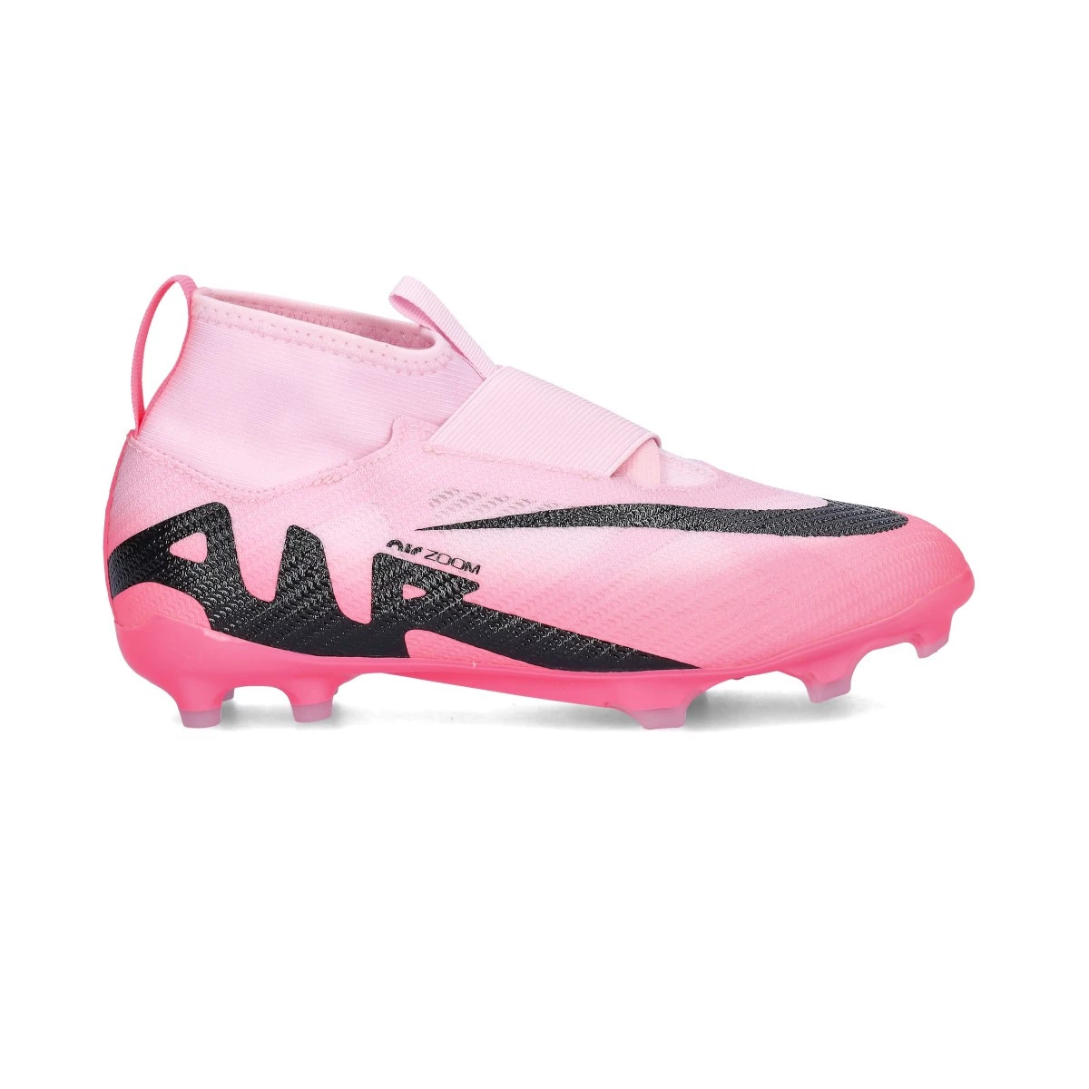 Chaussures de foot Nike Air Zoom Mercurial Superfly 9 Pro FG pour enfants. Chaussures en fil avec chaussette à utiliser sur terrains de gazon naturel sec ou humid. Chaussures hautes de gamme en Pink Foam-Black.