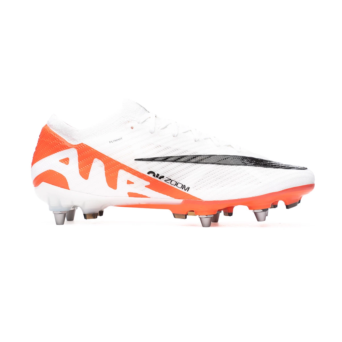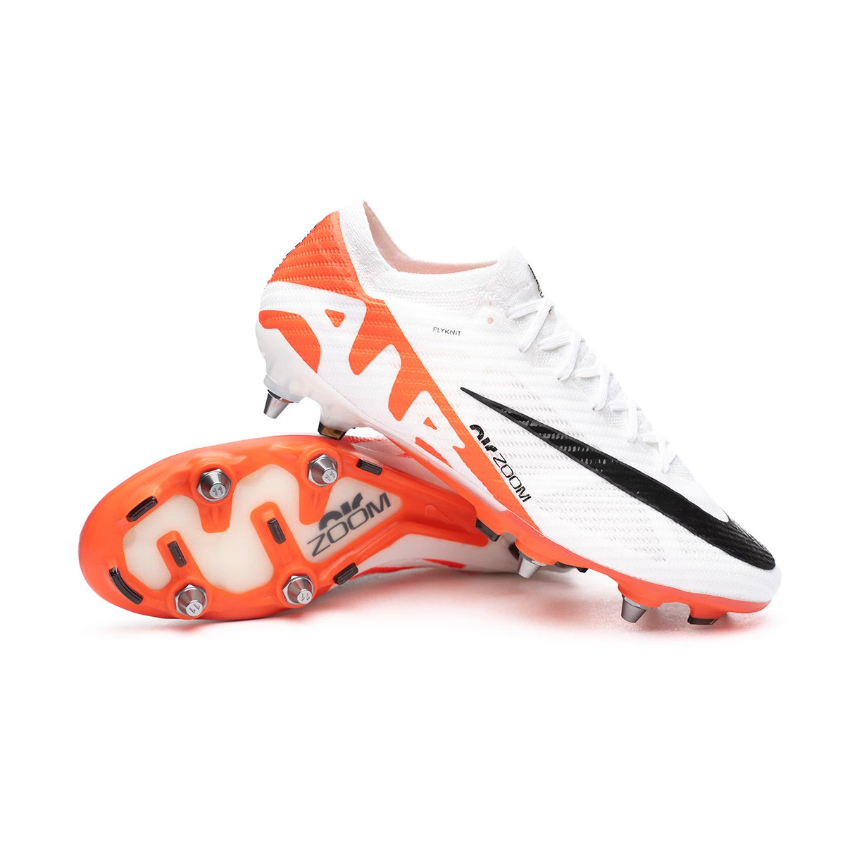 Chaussures de football Nike Zoom Mercurial Vapor 15 Elite SG-Pro. Chaussures à cordes pour une utilisation sur des terrains en gazon naturel mouillés ou humides. Chaussures haut de gamme de couleur Blanc-Orange