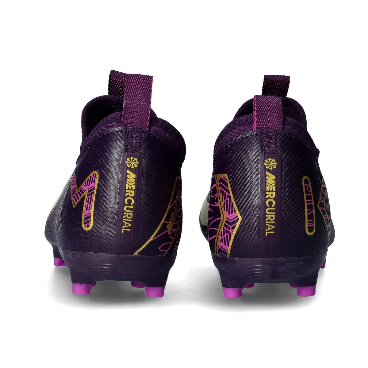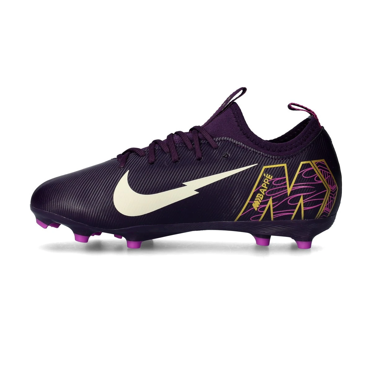 Chaussures de football Nike Air Zoom Mercurial Vapor 16 Academy KM FG/MG pour enfants. Chaussures filetées, à utiliser sur des terrains naturels ou en gazon artificiel de toute génération. Chaussures de milieu de gamme en couleur Grand Purple-Pale Ivory.